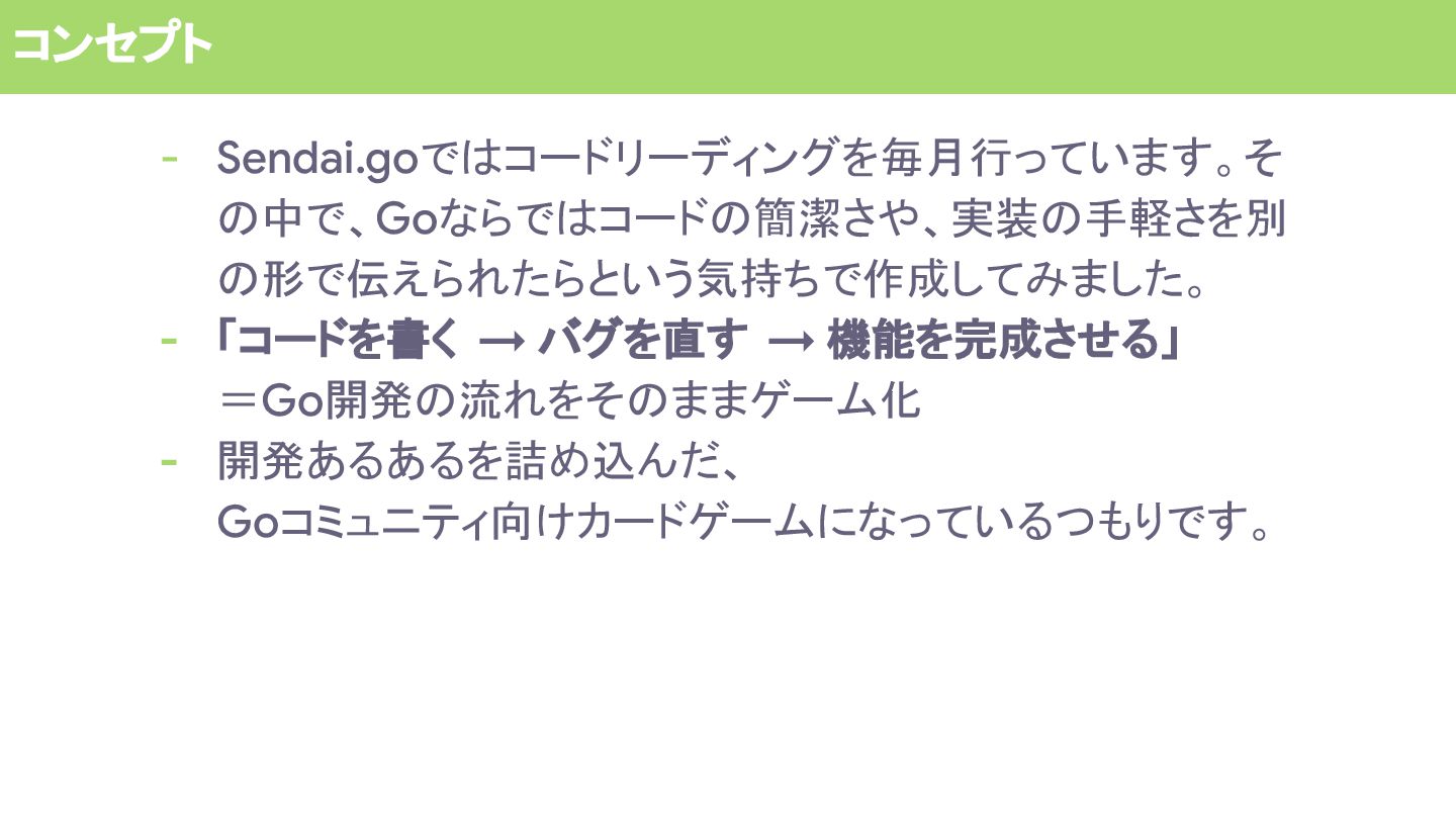 =Go開発の流れをそのままゲーム化 - 開発あるあるを詰め込んだ、 Goコミュニティ向けカードゲームになっているつもりです。 コンセプト