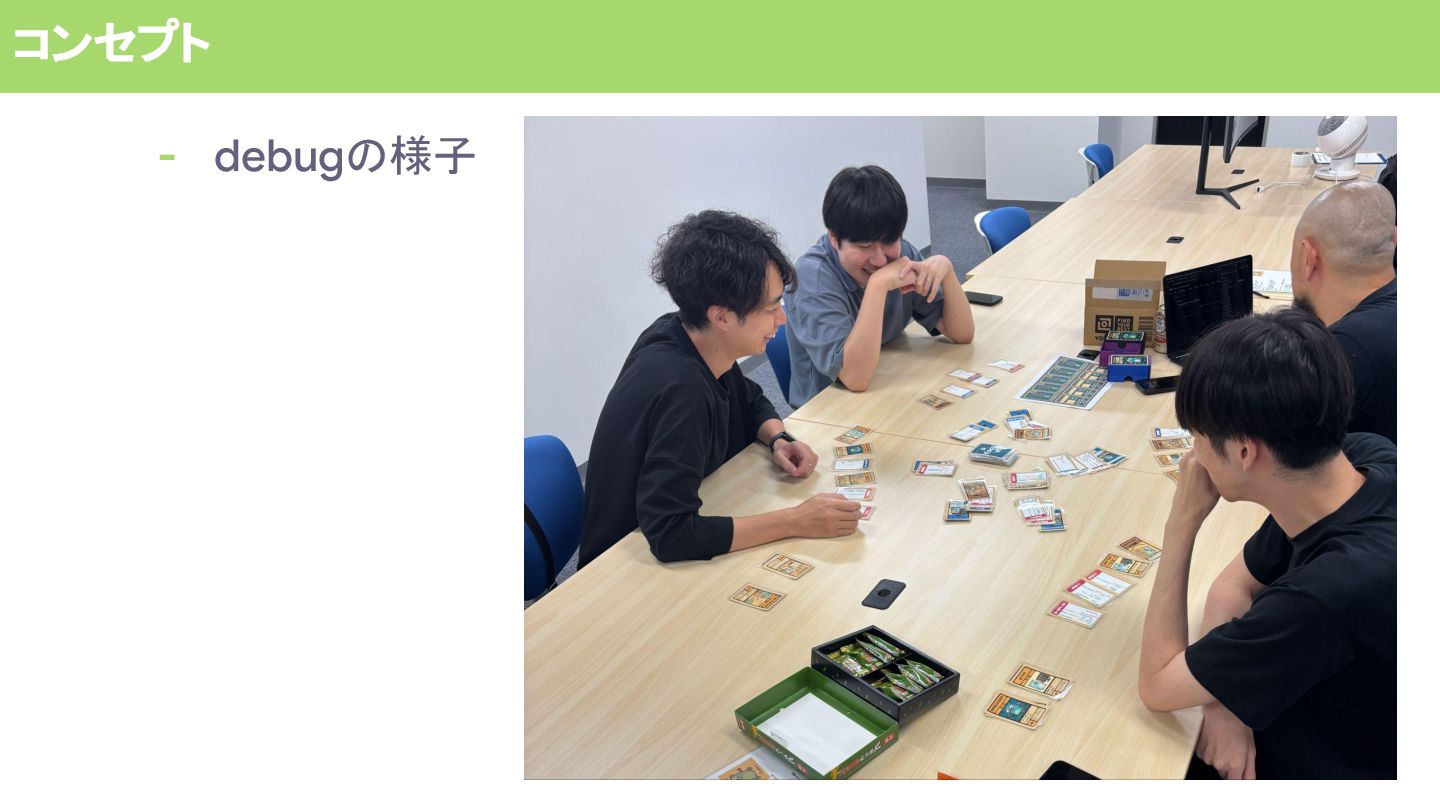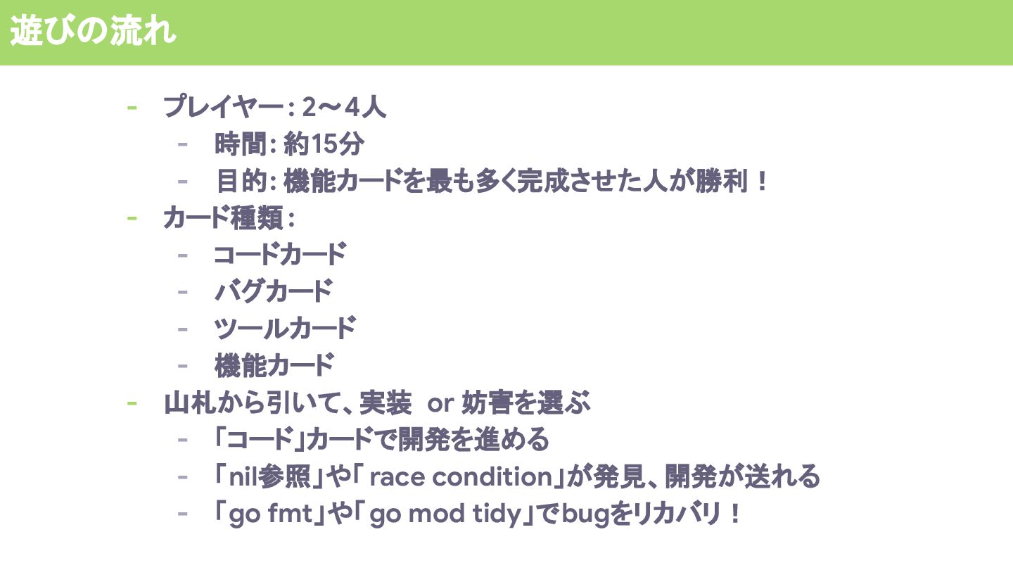 - カード種類 : - コードカード - バグカード - ツールカード - 機能カード - 山札から引いて、実装 or 妨害を選ぶ - 「コード」カードで開発を進める - 「nil参照」や「 race condition」が発見、開発が送れる - 「go fmt」や「go mod tidy」でbugをリカバリ! 遊びの流れ
