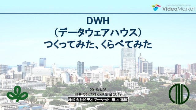 DWH (データウェアハウス) つくってみた、くらべてみた 株式会社ビデオマーケット 瀬上 祐匡 2019/1/26 PHPカンファレンス仙台2019