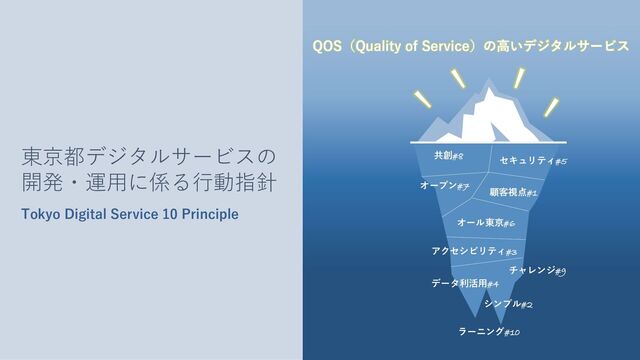 オール東京一丸となって取り組もう 都政の見える化をしよう 都民と共創しよう つねに見直し、チャレンジし続けよう ともに学びつづけよう #1 #2 #3 #4 #5 #6 #7 #8 #9 #10 顧客のための行政サービスを常に心がけ、顧客の声を聞き、 顧客の目線でデジタルサービスを構築・提供 標準化・共通化により本当に必要なものから シンプルにデジタルサービスを作っていくことを心掛ける 誰もが必要なサービスを享受できるよう、多様性に配慮し、 誰ひとり取り残されないデジタル社会をつくる 都民の資産であるデータを最大限に活用することで、 より良いデジタル社会を実現する 誰もが安全安心に利用できるデジタル化を実現し、 信頼できるデジタル社会を構築する 身近なサービスを提供する区市町村、デジタル社会形成を推進する 国と一丸になって、デジタルサービスを構築する 都政の活動を見える化し、広く都民が知り参加してもらうことで、 より良い都政を実現する 職員だけで考えるのではなく、都民の方々と共創することで、 より良いデジタル社会を構築する 前例にとらわれるのではなく、新たな価値創造を目指して チャレンジを続け、継続的な改善を促進する 関係者全員が学びを続けることで、 より良いデジタルサービスを構築・提供する #10