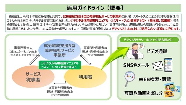 1.デジタルツールの導入及び運用 • ルールは利用者、サービス従事者が無理なく普段の作業に沿って行えるよう配慮して決めます。 • 利用者のデジタルスキルに応じてルールの策定を行います。 • 利用者ごとのデジタルスキルを把握し、一人でも多くの利用者が取組める運用内容を策定します。 • 数人以上で共有する場合は画面が大きいタブレットなど目的によってデバイス機器を選定します。 • 事業所の通信環境は運用の内容や、利用頻度に応じて検討が必要です。 • 継続的な運用を行う場合は無線LANの導入や、専用機器の導入も選択肢として考えましょう。 • 運用開始後は、様子を見て状況に応じて、ルールの見直しを行った方が良い場合もあります。 • 安心安全のためルールやマナーの注意喚起を定期的に実施し、スマホトラブルを未然に防ぎます。 ①デジタル活用運用マニュアル 1.デジタルツールの導入及び運用 3 活用ガイドライン 【活用の流れ】