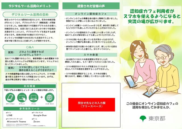 会議ツールなどの必要物を手配しましょう。 STEP 1 周知・参加者をフォローしましょう 参加者を募集するためには広報活動が必須です。 効果的な媒体で参加者を募集しましょう。 STEP 2 オンライン認知症カフェを開催しよ う 開始前に出席確認、音声の確認、画面の確認を 行いましょう。フォローが必要な人がいる場合は サポートしながら行います。慣れない方が多いので こまめに休憩をはさみながら進行していきます。 STEP 3 発展した使い方を実践しましょう 日頃から行っている情報提供はSNSなどを活用して オンラインで受け取ってもらいましょう。 また運営者同士でW e b会議や既に実施している オンライン認知症カフェの運用を見学してみましょう。 STEP 4 運用マニュアルやテキストは下記からダウンロードしてください。 開催事例 オンラインでの近況報告をしよう。 メリット オンライン会議ツールを使用するので 離れていても表情がわかりますし、 家にいながらでも参加してもらえます。 x 完 全 オ ン ラ イ ン 開 催 型 参加者が全員オンラインで参加する形式です。 参加者・運営者ともに場所に縛られることなく開催する ことができます。 x オ ン ラ イ ン ・ 会 場 併 用 開 催 型 参加者の一部は会場、一部はオンラインで参加する形式 です。参加者の都合に合わせて参加方法を決めてもらう ことができます。 x ス マ ホ 教 室 型 スマホ教室を開催することで、スマートフォンの魅力や 日常で使う操作について、知ってもらう機会を認知症 カフェの中で設けます。 その場でオンラインで交流することを体験していただく ことで、オンライン認知症カフェへの参加へとつなげる ことも可能です。 オンライン認知症カフェの開催形式 メール送受信 カメラ/動画 インターネット検索 マップの使い方 オンラインを活用した 合同イベントを実施してみましょう。 オンライン認知症カフェの運営に慣 れてきたら、他の認知症カフェとの オンラインを活用した連携も検討し てみましょう。オンラインを使うこ とで様々な制約がなくなります。 オンラインを使った合同イベントな ど、これまで想像していなかった新 しい スマホ教室 参加者のスマートフォンの理解度に合わせて 用意されたテキストを使いスマホ教室を実施。 開催事例 スマホの操作や使い方を学ぼう。 メリット 参加した人はスマホを使えるように なり、インターネットを使った情報 を受け取ることができたり、 オンラインのイベントに参加しても らえるようになります。 スマホ教室とオンライン認知症カフェを実施される運営者様に 運営に必要なテキストやマニュアルをご用意しています! ス マ ホ 教 室 カ リ キ ュ ラ ム 例 ( 習 得 内 容 ) 基本操作 電話のかけ方 文字入力 URLやQRコードなどの入力欄 (フリースペース) オンライン認知症カフェとは 発展型のコミュニティ運用 認知症カフェでの活用について 現在の認知症カフェの運用を大きく変えずとも、 デジタル運用を取り入れることで、スマホで離れた 相手とオンラインで認知症カフェを実施できます。 例えば 認知症カフェに参加したいが、体調の 関係で外出が難しい時でもオンライン なら認知症カフェにご参加頂けます。