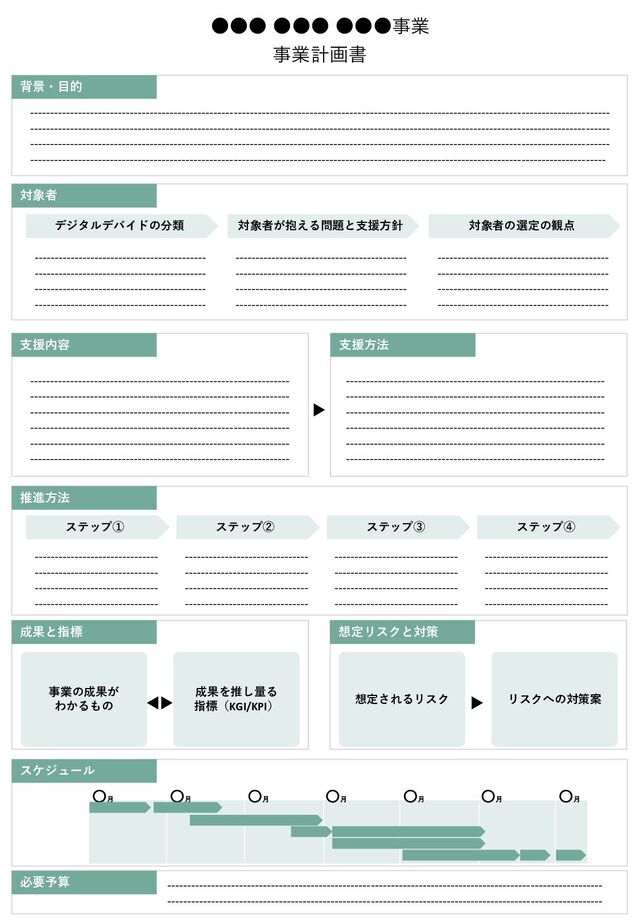〇月 背景・目的 対象者 支援内容 支援方法 推進方法 スケジュール 必要予算 成果と指標 想定リスクと対策 ステップ① ステップ② ステップ③ ステップ④ 事業の成果が わかるもの 成果を推し量る 指標(KGI/KPI) 想定されるリスク リスクへの対策案 デジタルデバイドの分類 対象者が抱える問題と支援方針 対象者の選定の観点 ------------------------------------------- ------------------------------------------- ------------------------------------------- ------------------------------------------- ------------------------------------------- ------------------------------------------- ------------------------------------------- ------------------------------------------- ------------------------------------------- ------------------------------------------- ------------------------------------------- ------------------------------------------- ------------------------------- ------------------------------- ------------------------------- ------------------------------- ------------------------------- ------------------------------- ------------------------------- ------------------------------- ------------------------------- ------------------------------- ------------------------------- ------------------------------- ------------------------------- ------------------------------- ------------------------------- ------------------------------- ----------------------------------------------------------------- ----------------------------------------------------------------- ----------------------------------------------------------------- ----------------------------------------------------------------- ----------------------------------------------------------------- ----------------------------------------------------------------- ----------------------------------------------------------------- ----------------------------------------------------------------- ----------------------------------------------------------------- ----------------------------------------------------------------- ----------------------------------------------------------------- ----------------------------------------------------------------- ------------------------------------------------------------------------------------------------------------------------------------------------- ------------------------------------------------------------------------------------------------------------------------------------------------- ------------------------------------------------------------------------------------------------------------------------------------------------- ------------------------------------------------------------------------------------------------------------------------------------------------ ------------------------------------------------------------------------------------------------------------- -------------------------------------------------------------------------------------------------------------