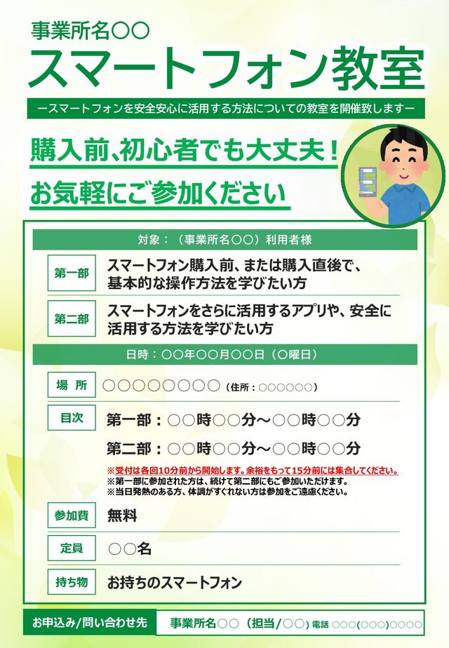 第二部 スマートフォンをさらに活用するアプリや、安全に 活用する方法を学びたい方 日時:◦◦年◦◦月◦◦日(〇曜日) 第一部:◦◦時◦◦分~◦◦時◦◦分 目次 第二部:◦◦時◦◦分~◦◦時◦◦分 ※受付は各回10分前から開始します。余裕をもって15分前には集合してください。 ※第一部に参加された方は、続けて第二部にもご参加いただけます。 ※当日発熱のある方、体調がすぐれない方は参加をご遠慮ください。 ◦◦◦◦◦◦◦◦(住所:◦◦◦◦◦◦) 場 所 ◦◦名 定員 持ち物 お持ちのスマートフォン 無料 参加費 お申込み/問い合わせ先 事業所名◦◦(担当/◦◦) 電話 ◦◦◦(◦◦◦)◦◦◦◦