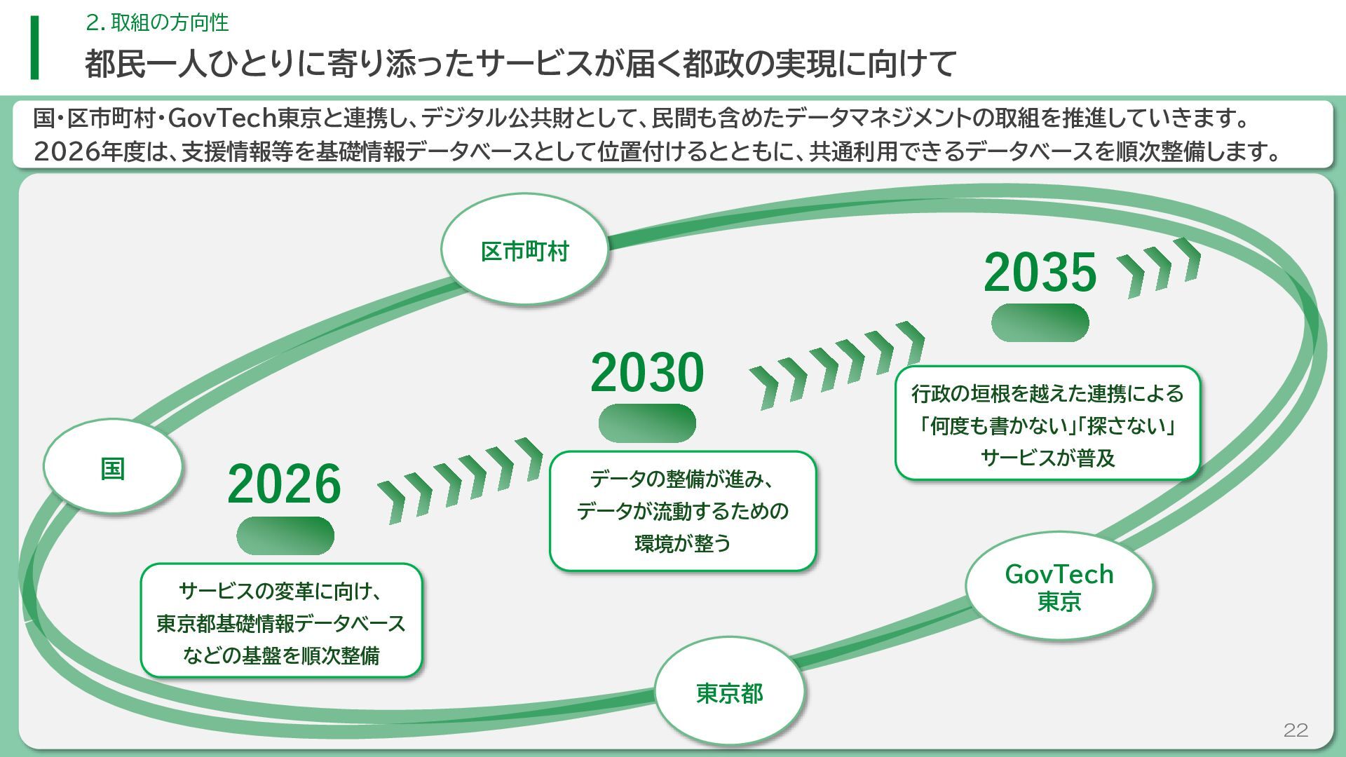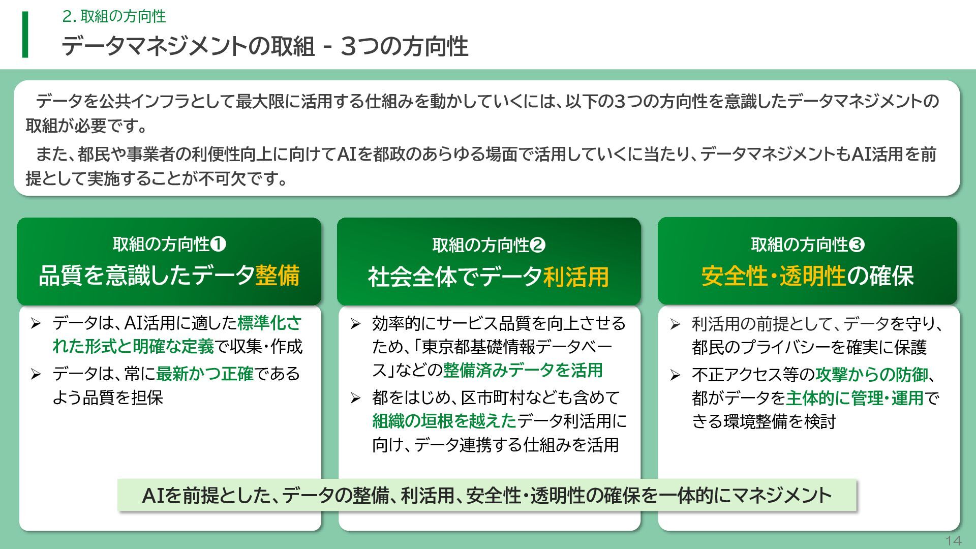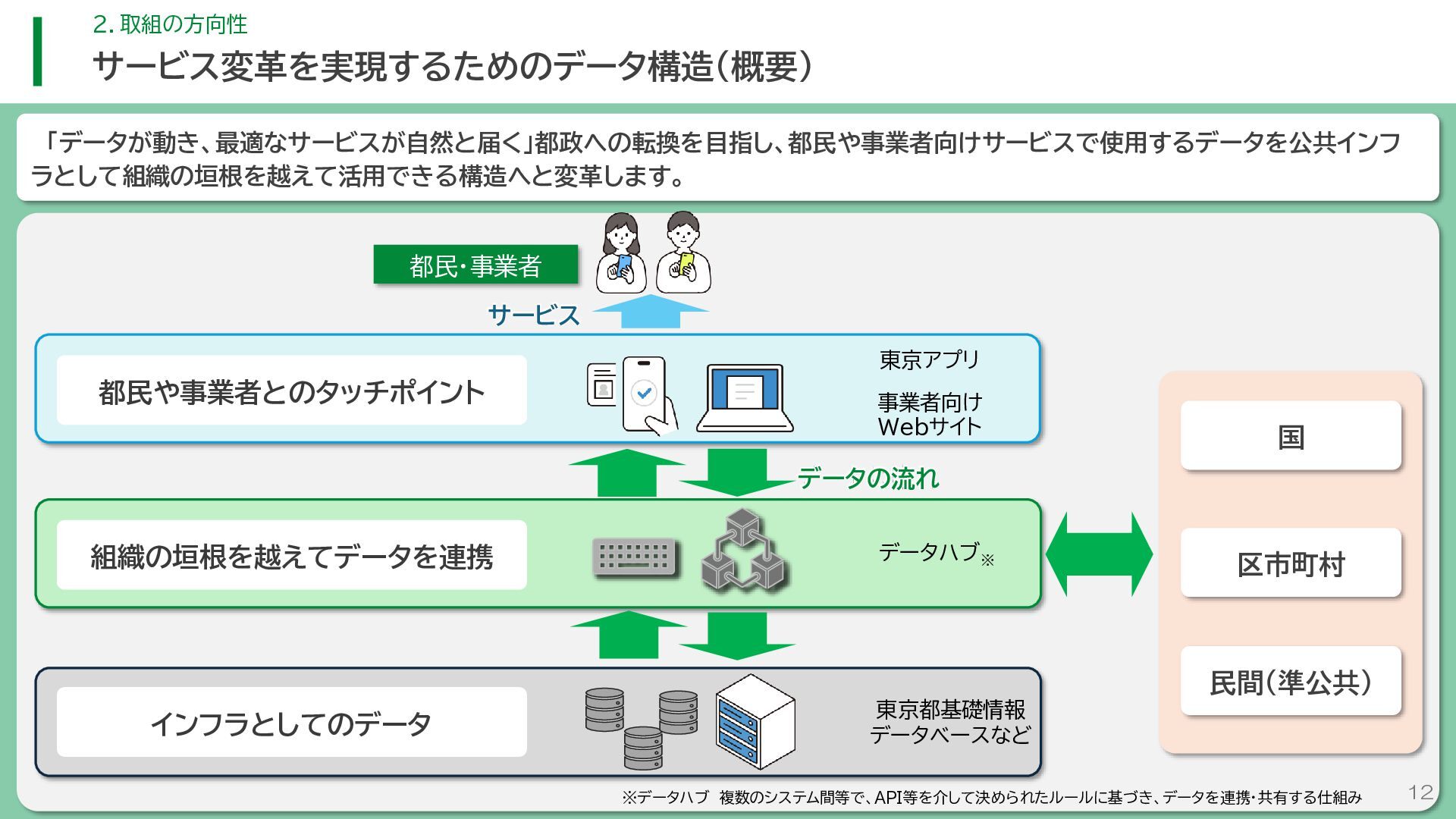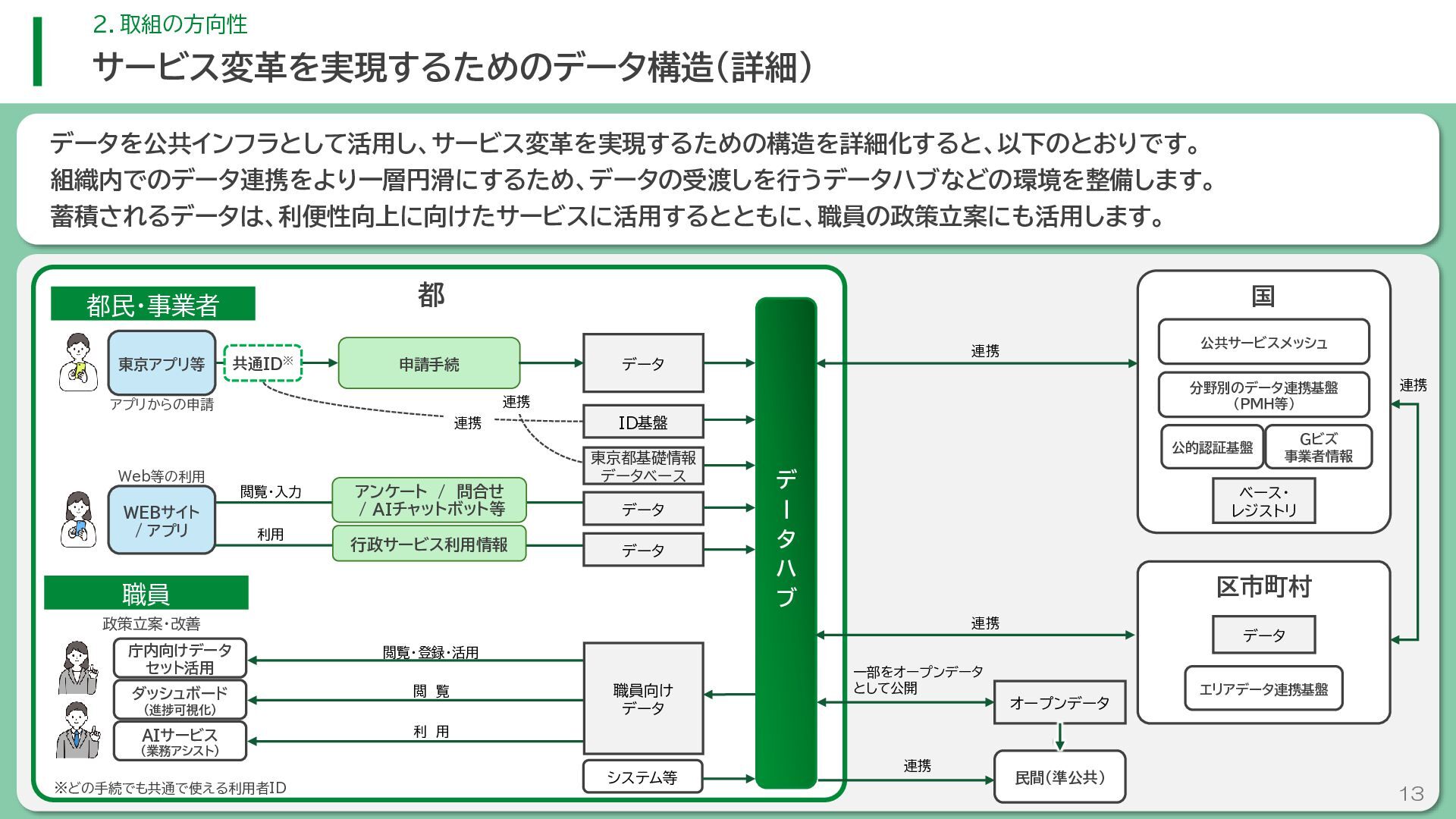 閲 覧 利 用 システム等 政策立案・改善 連携 アンケート / 問合せ / AIチャットボット等 共通ID※ 連携 連携 一部をオープンデータ として公開 東京アプリ等 連携 連携 データ 東京都基礎情報 データベース データ 都民・事業者 申請手続 WEBサイト / アプリ 利用 行政サービス利用情報 データ デ ー タ ハ ブ ID基盤 13 2.取組の方向性 サービス変革を実現するためのデータ構造(詳細) オープンデータ 民間(準公共) 連携 アプリからの申請 Web等の利用 データを公共インフラとして活用し、サービス変革を実現するための構造を詳細化すると、以下のとおりです。 組織内でのデータ連携をより一層円滑にするため、データの受渡しを行うデータハブなどの環境を整備します。 蓄積されるデータは、利便性向上に向けたサービスに活用するとともに、職員の政策立案にも活用します。 公共サービスメッシュ 公的認証基盤 分野別のデータ連携基盤 (PMH等) Gビズ 事業者情報 ベース・ レジストリ エリアデータ連携基盤 データ 職員向け データ ※どの手続でも共通で使える利用者ID 国 区市町村