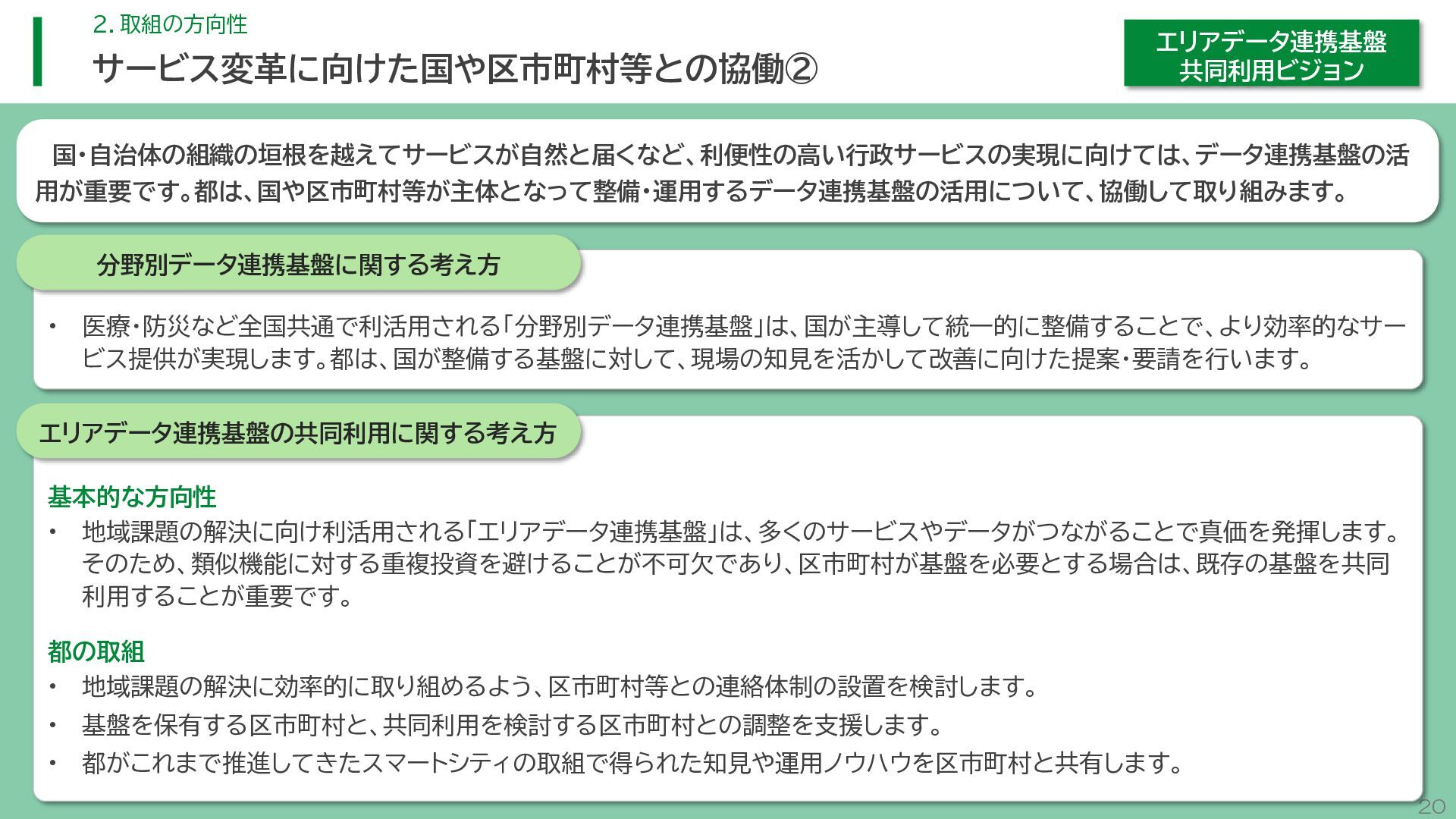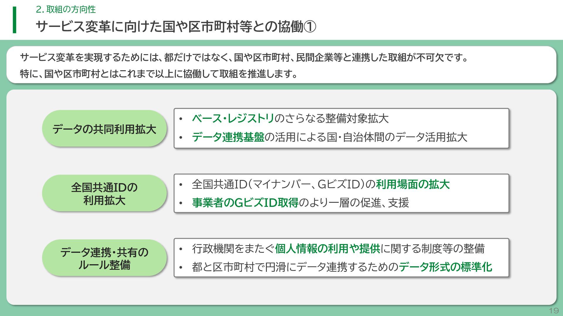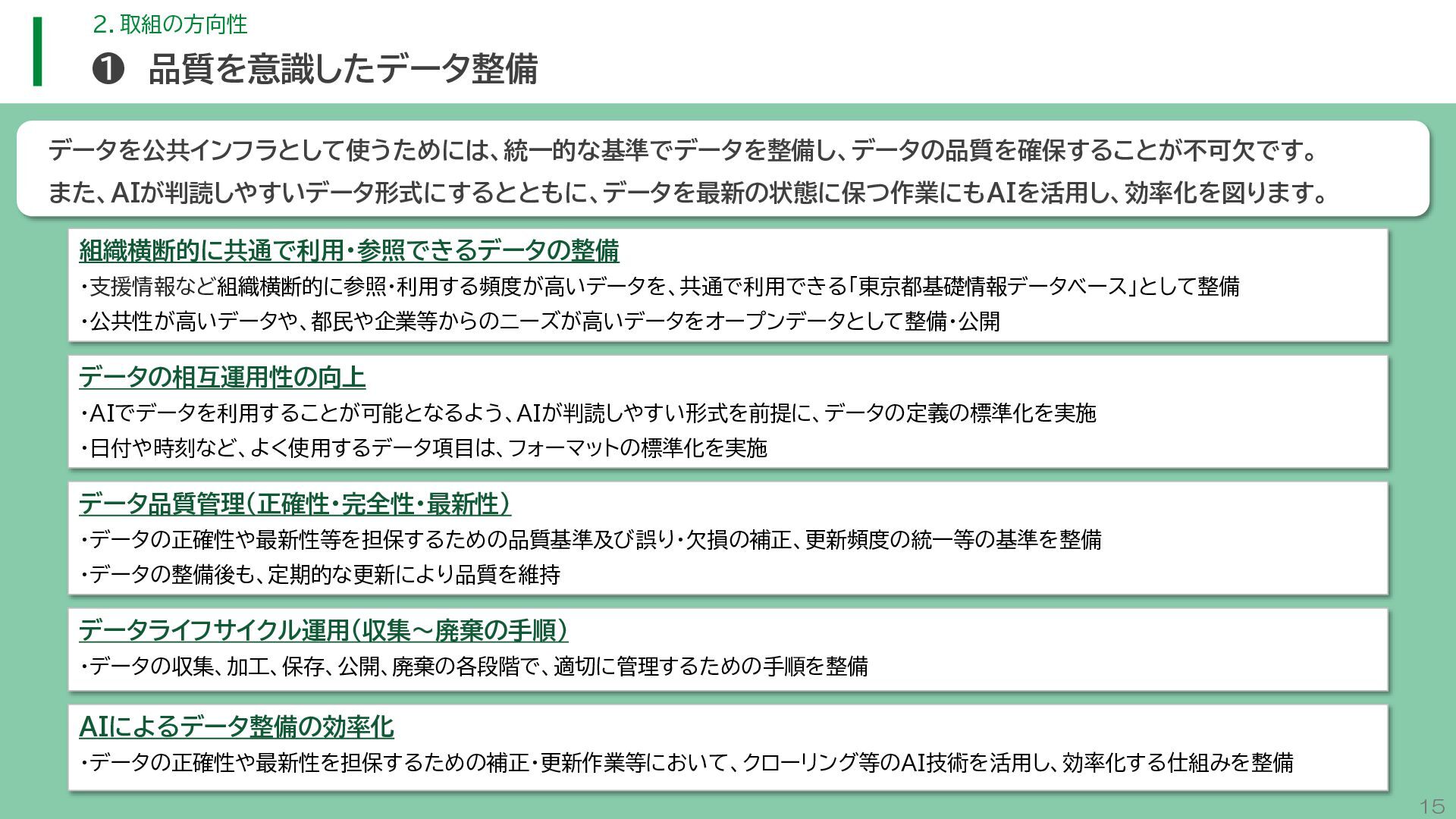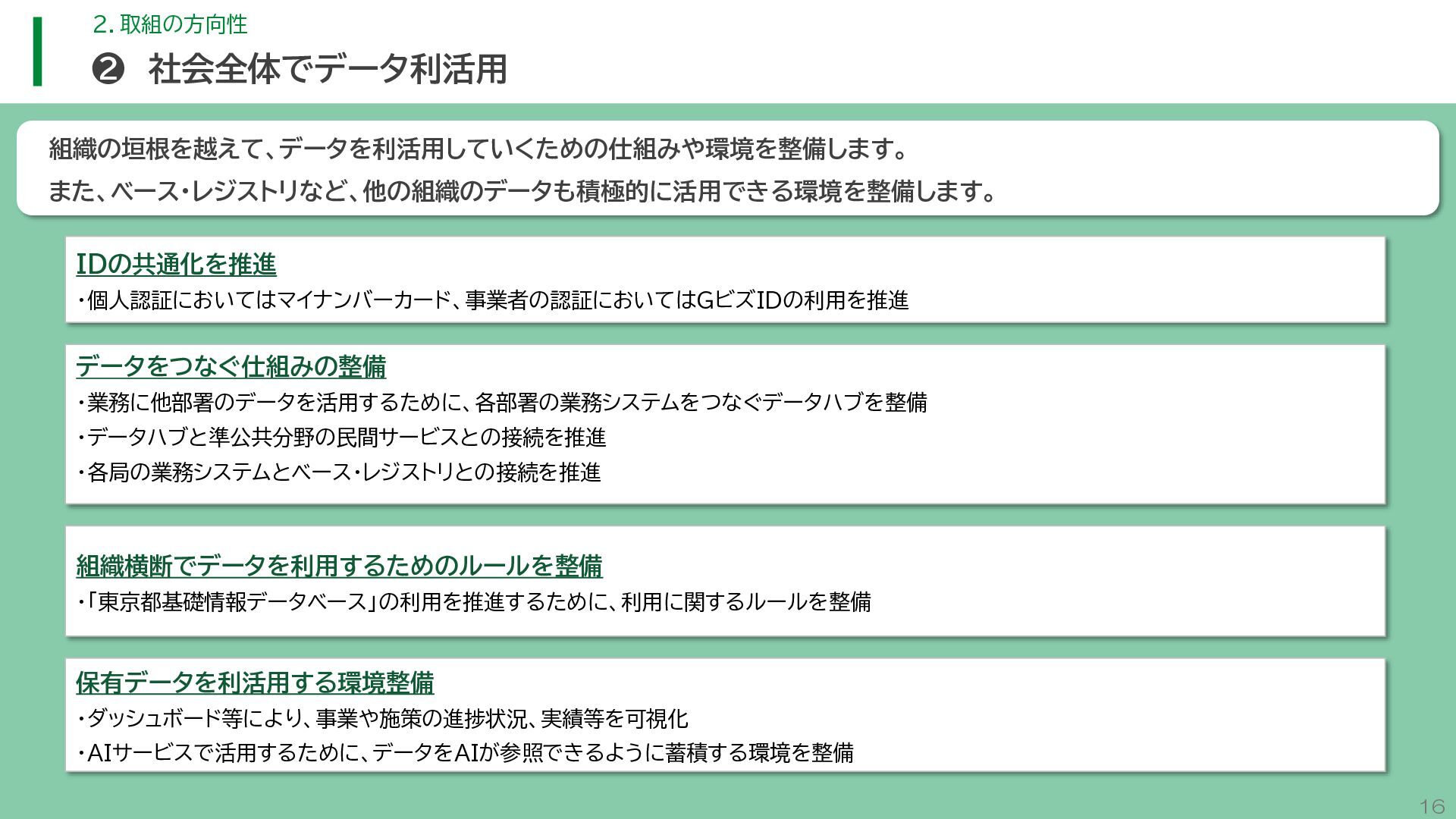 閲 覧 利 用 システム等 政策立案・改善 連携 アンケート / 問合せ / AIチャットボット等 共通ID※ 連携 連携 一部をオープンデータ として公開 東京アプリ等 連携 連携 データ 東京都基礎情報 データベース データ 都民・事業者 申請手続 WEBサイト / アプリ 利用 行政サービス利用情報 データ デ ー タ ハ ブ ID基盤 13 2.取組の方向性 サービス変革を実現するためのデータ構造(詳細) オープンデータ 民間(準公共) 連携 アプリからの申請 Web等の利用 データを公共インフラとして活用し、サービス変革を実現するための構造を詳細化すると、以下のとおりです。 組織内でのデータ連携をより一層円滑にするため、データの受渡しを行うデータハブなどの環境を整備します。 蓄積されるデータは、利便性向上に向けたサービスに活用するとともに、職員の政策立案にも活用します。 公共サービスメッシュ 公的認証基盤 分野別のデータ連携基盤 (PMH等) Gビズ 事業者情報 ベース・ レジストリ エリアデータ連携基盤 データ 職員向け データ ※どの手続でも共通で使える利用者ID 国 区市町村