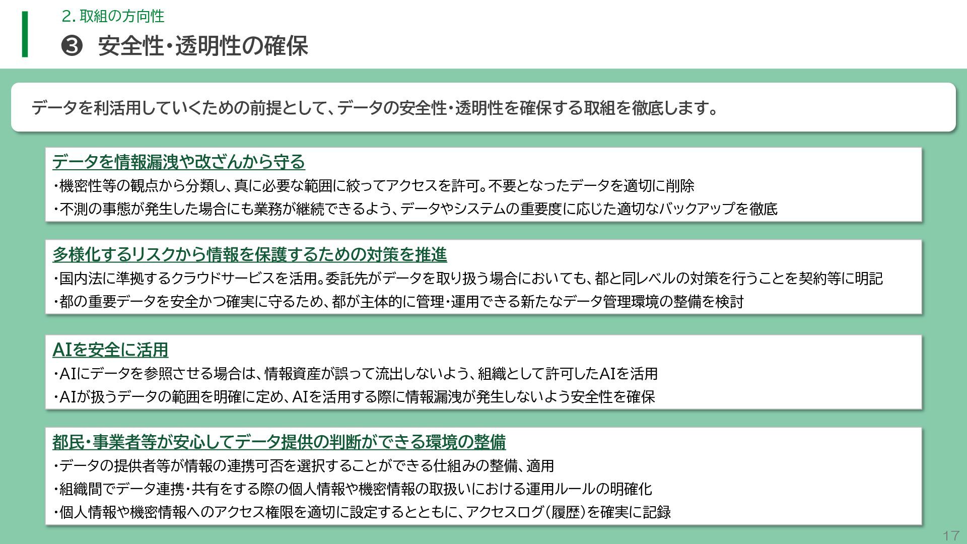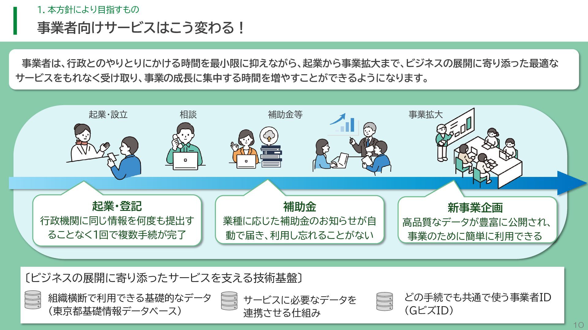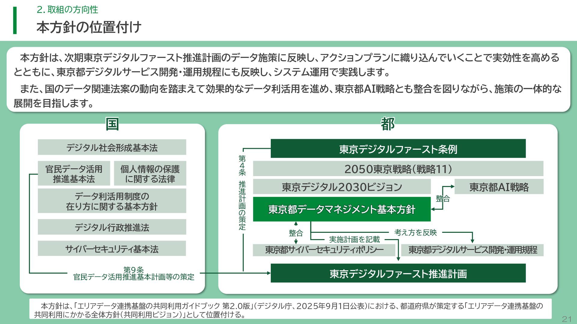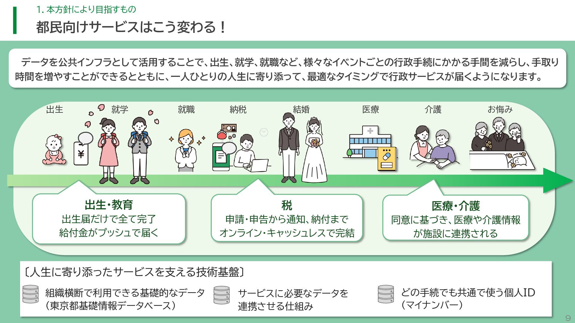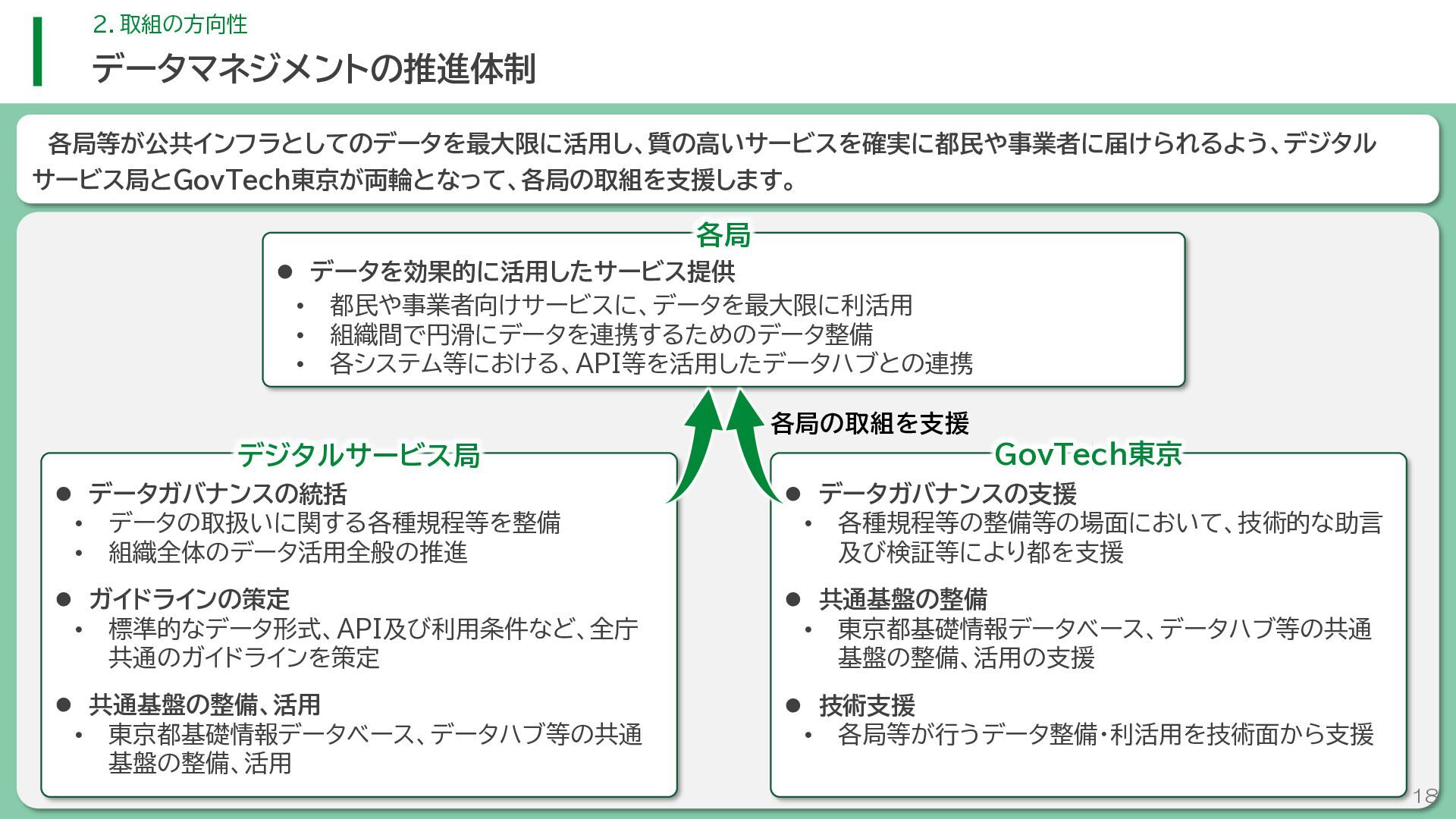 閲 覧 利 用 システム等 政策立案・改善 連携 アンケート / 問合せ / AIチャットボット等 共通ID※ 連携 連携 一部をオープンデータ として公開 東京アプリ等 連携 連携 データ 東京都基礎情報 データベース データ 都民・事業者 申請手続 WEBサイト / アプリ 利用 行政サービス利用情報 データ デ ー タ ハ ブ ID基盤 13 2.取組の方向性 サービス変革を実現するためのデータ構造(詳細) オープンデータ 民間(準公共) 連携 アプリからの申請 Web等の利用 データを公共インフラとして活用し、サービス変革を実現するための構造を詳細化すると、以下のとおりです。 組織内でのデータ連携をより一層円滑にするため、データの受渡しを行うデータハブなどの環境を整備します。 蓄積されるデータは、利便性向上に向けたサービスに活用するとともに、職員の政策立案にも活用します。 公共サービスメッシュ 公的認証基盤 分野別のデータ連携基盤 (PMH等) Gビズ 事業者情報 ベース・ レジストリ エリアデータ連携基盤 データ 職員向け データ ※どの手続でも共通で使える利用者ID 国 区市町村