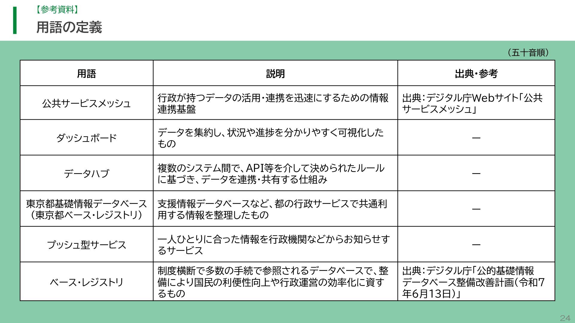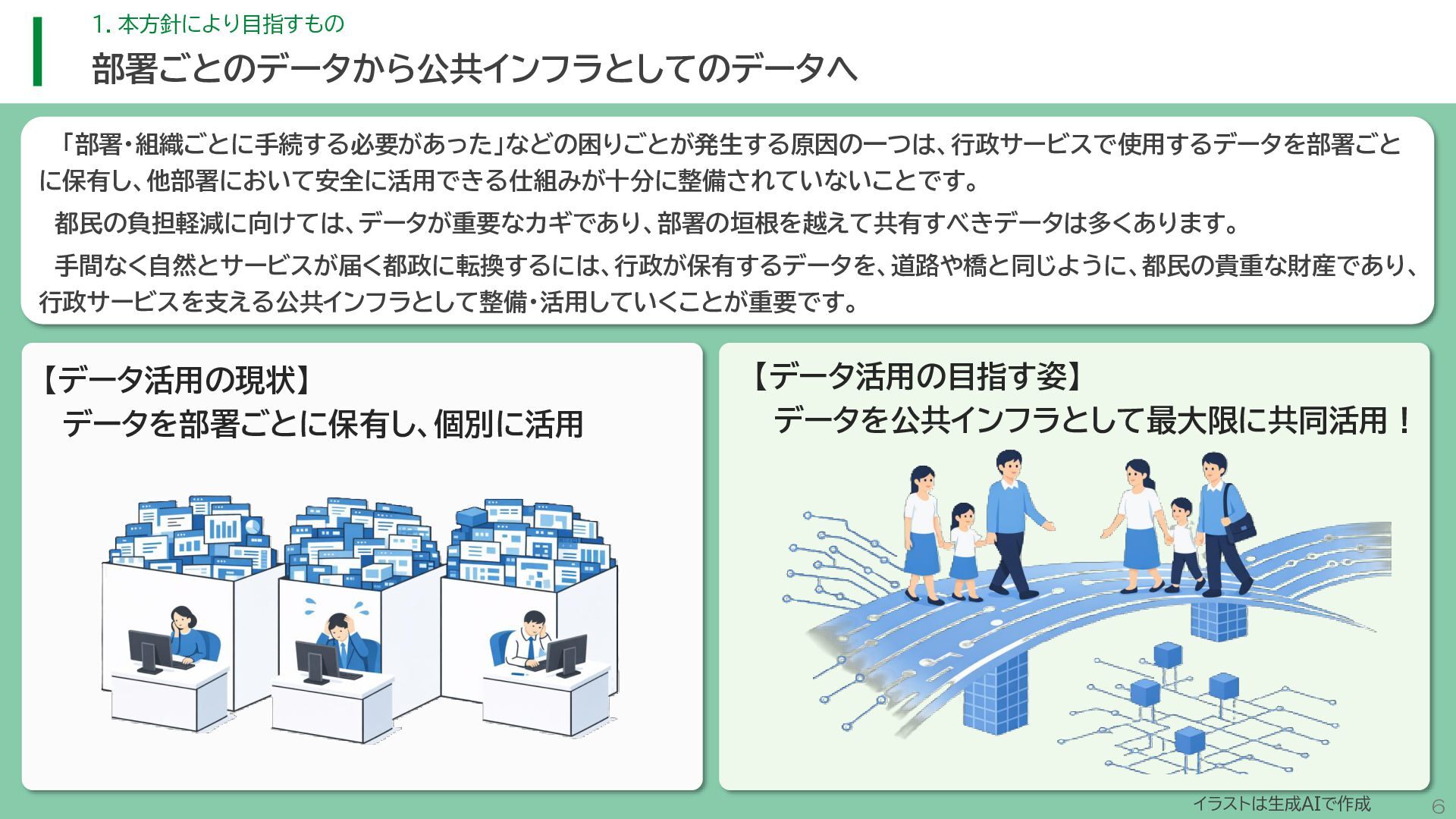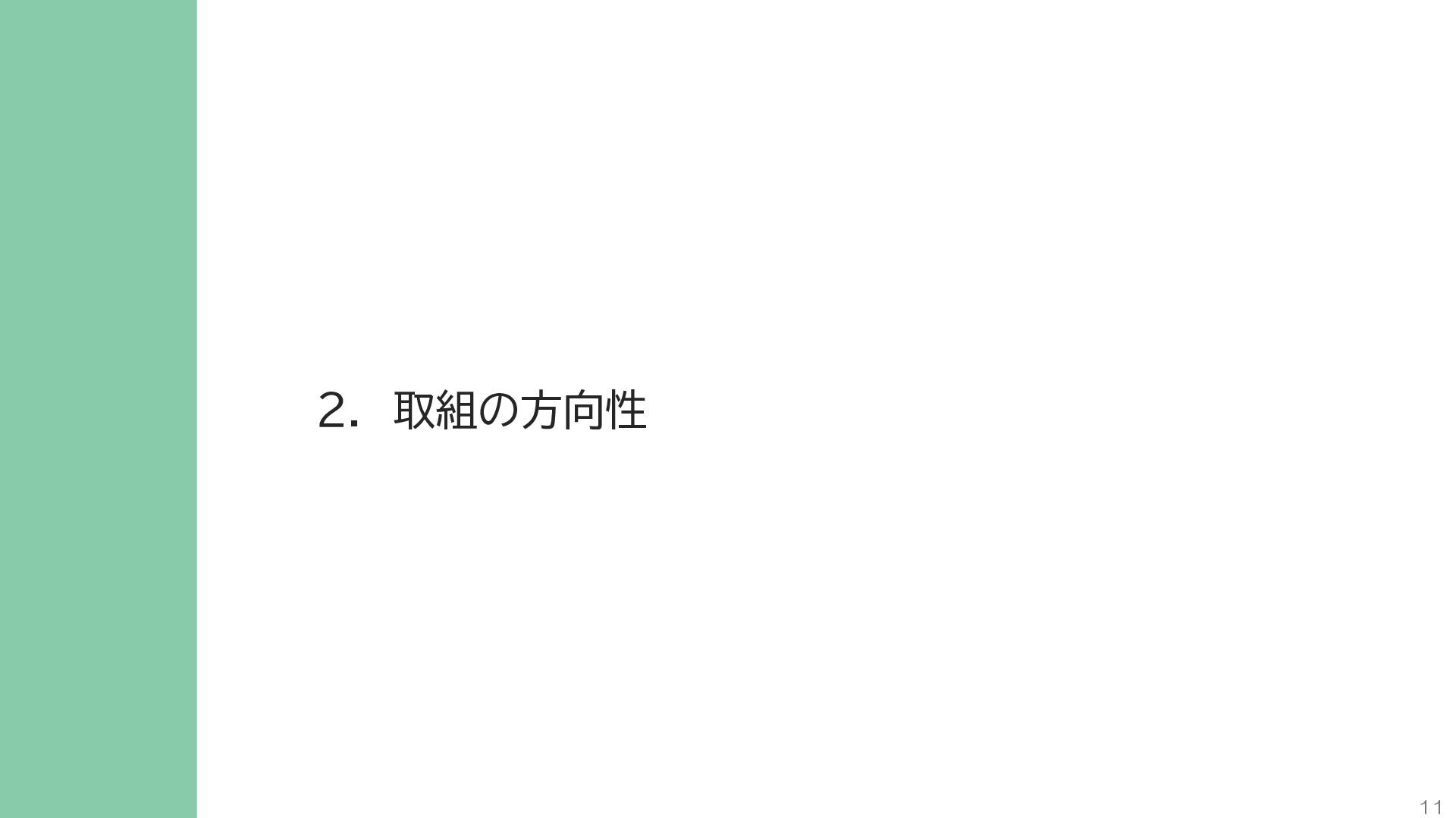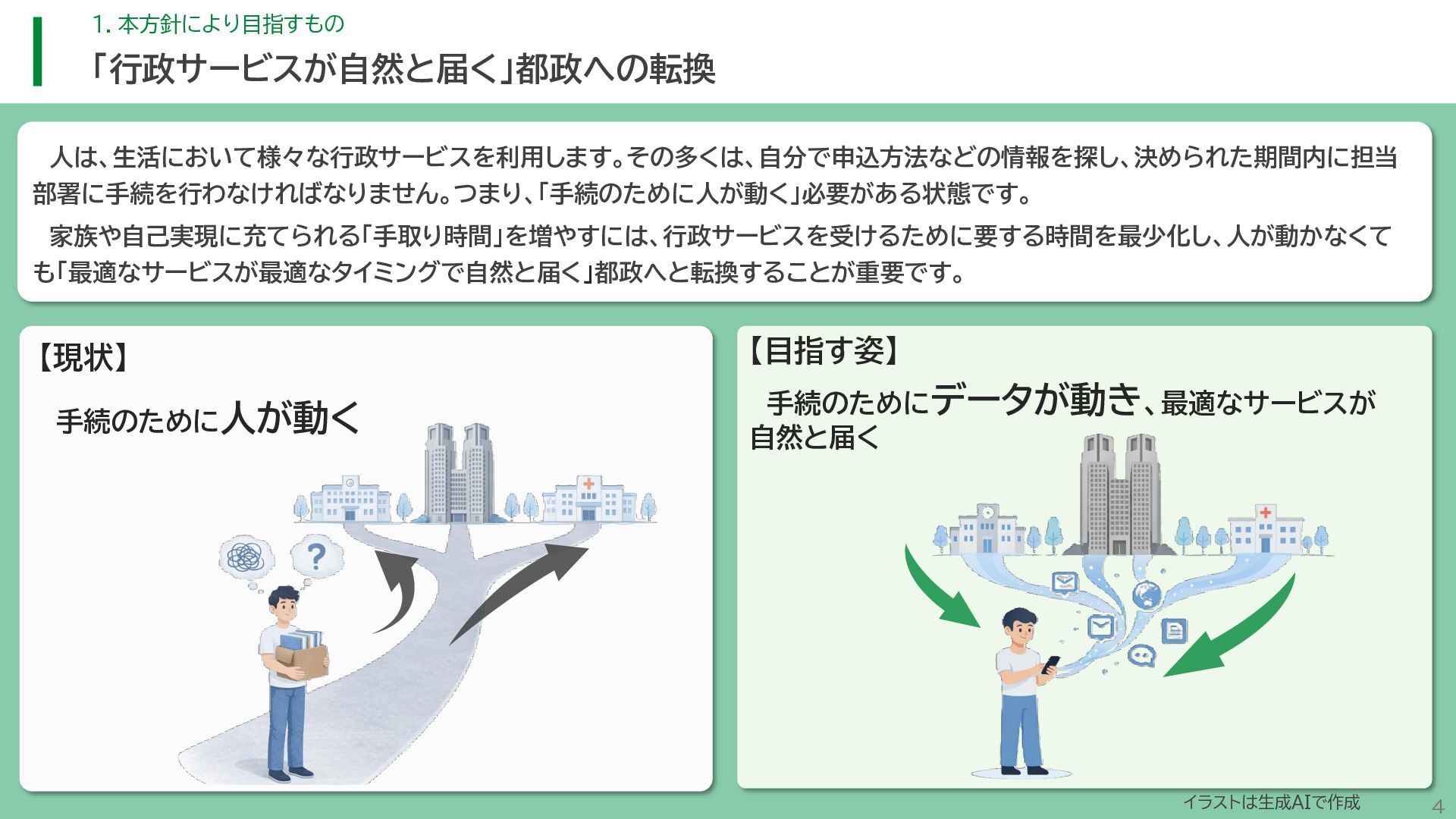 閲 覧 利 用 システム等 政策立案・改善 連携 アンケート / 問合せ / AIチャットボット等 共通ID※ 連携 連携 一部をオープンデータ として公開 東京アプリ等 連携 連携 データ 東京都基礎情報 データベース データ 都民・事業者 申請手続 WEBサイト / アプリ 利用 行政サービス利用情報 データ デ ー タ ハ ブ ID基盤 13 2.取組の方向性 サービス変革を実現するためのデータ構造(詳細) オープンデータ 民間(準公共) 連携 アプリからの申請 Web等の利用 データを公共インフラとして活用し、サービス変革を実現するための構造を詳細化すると、以下のとおりです。 組織内でのデータ連携をより一層円滑にするため、データの受渡しを行うデータハブなどの環境を整備します。 蓄積されるデータは、利便性向上に向けたサービスに活用するとともに、職員の政策立案にも活用します。 公共サービスメッシュ 公的認証基盤 分野別のデータ連携基盤 (PMH等) Gビズ 事業者情報 ベース・ レジストリ エリアデータ連携基盤 データ 職員向け データ ※どの手続でも共通で使える利用者ID 国 区市町村