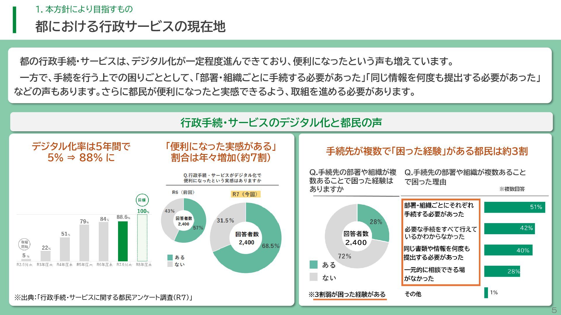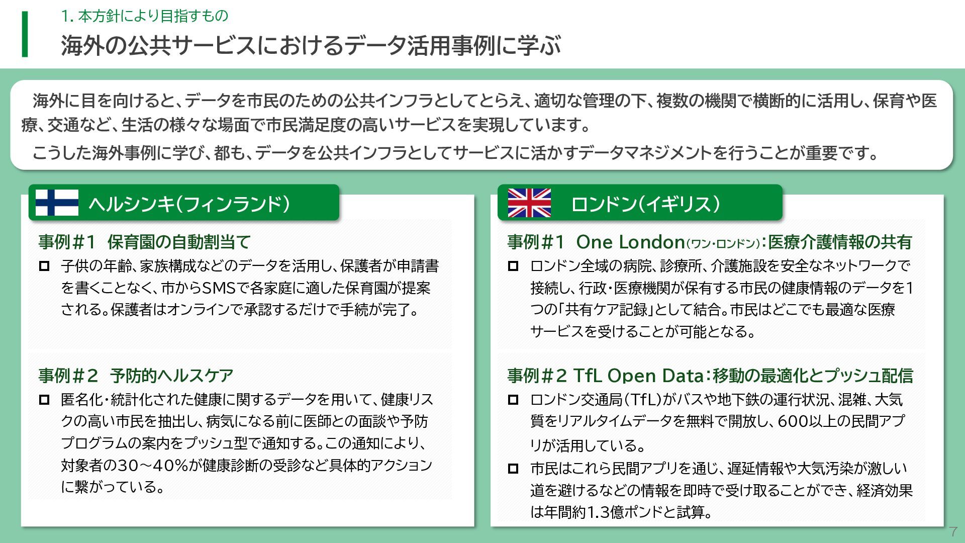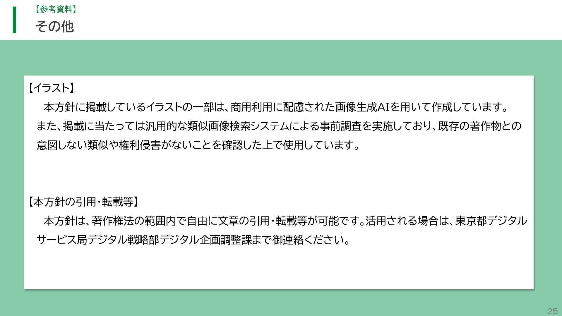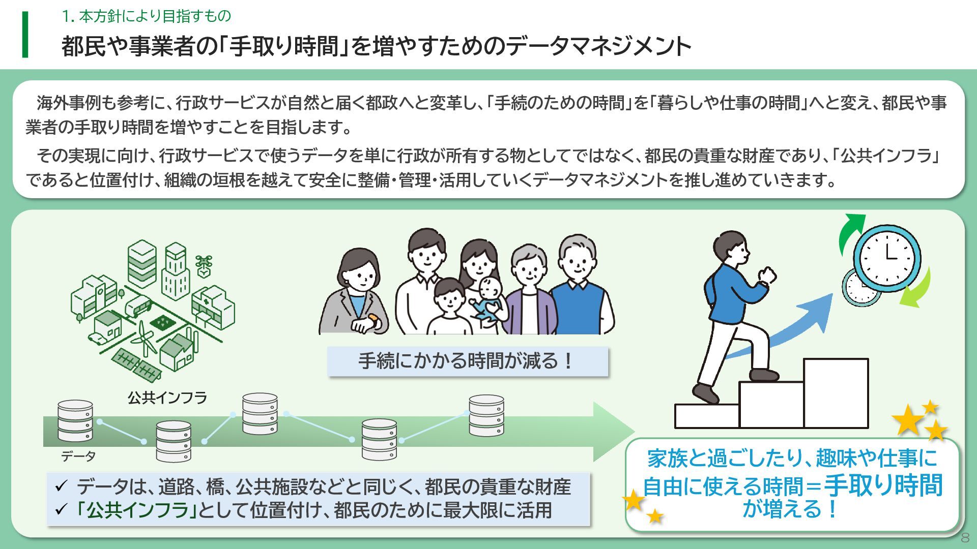 閲 覧 利 用 システム等 政策立案・改善 連携 アンケート / 問合せ / AIチャットボット等 共通ID※ 連携 連携 一部をオープンデータ として公開 東京アプリ等 連携 連携 データ 東京都基礎情報 データベース データ 都民・事業者 申請手続 WEBサイト / アプリ 利用 行政サービス利用情報 データ デ ー タ ハ ブ ID基盤 13 2.取組の方向性 サービス変革を実現するためのデータ構造(詳細) オープンデータ 民間(準公共) 連携 アプリからの申請 Web等の利用 データを公共インフラとして活用し、サービス変革を実現するための構造を詳細化すると、以下のとおりです。 組織内でのデータ連携をより一層円滑にするため、データの受渡しを行うデータハブなどの環境を整備します。 蓄積されるデータは、利便性向上に向けたサービスに活用するとともに、職員の政策立案にも活用します。 公共サービスメッシュ 公的認証基盤 分野別のデータ連携基盤 (PMH等) Gビズ 事業者情報 ベース・ レジストリ エリアデータ連携基盤 データ 職員向け データ ※どの手続でも共通で使える利用者ID 国 区市町村