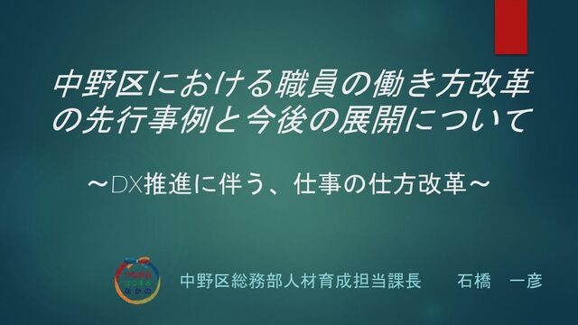 中野区における職員の働き方改革 の先行事例と今後の展開について ~DX推進に伴う、仕事の仕方改革~ 中野区総務部人材育成担当課長 石橋 一彦