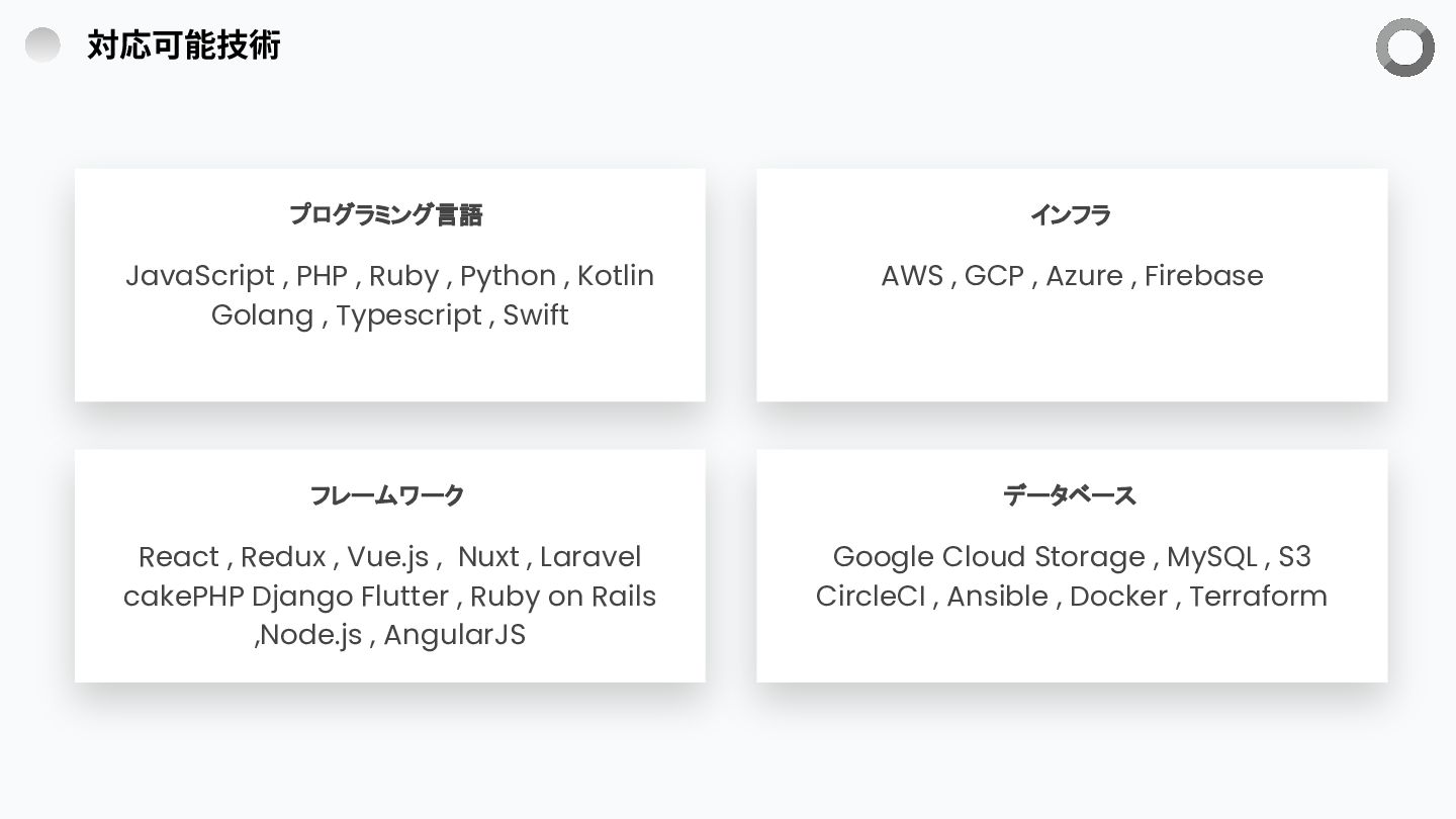 Kotlin Golang , Typescript , Swift インフラ AWS , GCP , Azure , Firebase フレームワーク React , Redux , Vue.js , Nuxt , Laravel cakePHP Django Flutter , Ruby on Rails ,Node.js , AngularJS データベース Google Cloud Storage , MySQL , S3 CircleCI , Ansible , Docker , Terraform