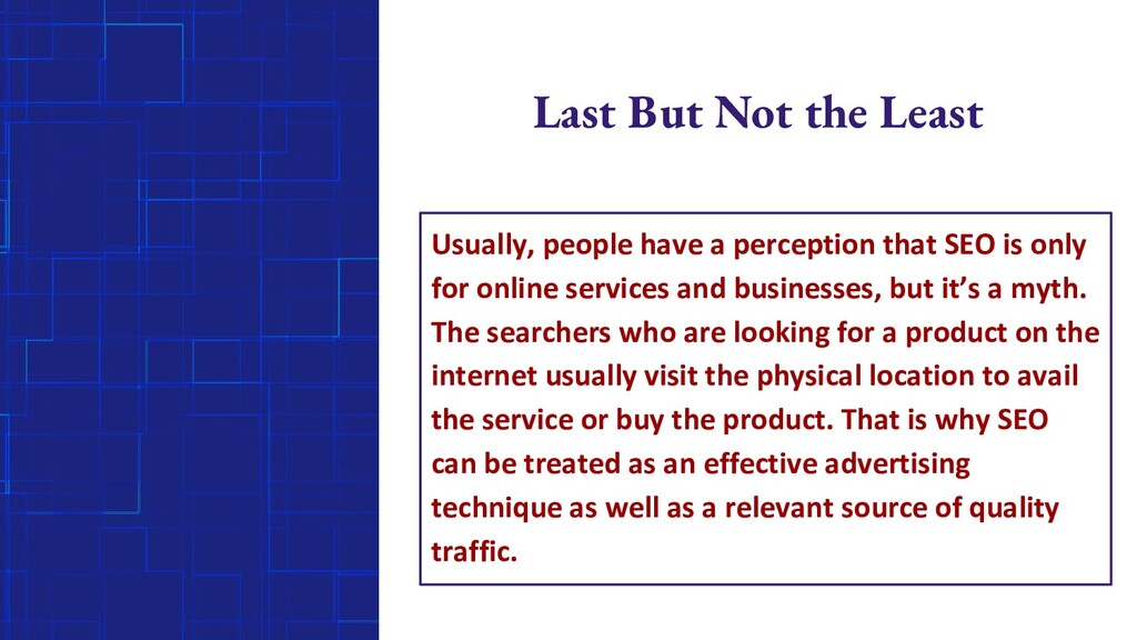 that SEO is only for online services and businesses, but it’s a myth. The searchers who are looking for a product on the internet usually visit the physical location to avail the service or buy the product. That is why SEO can be treated as an effective advertising technique as well as a relevant source of quality traffic.