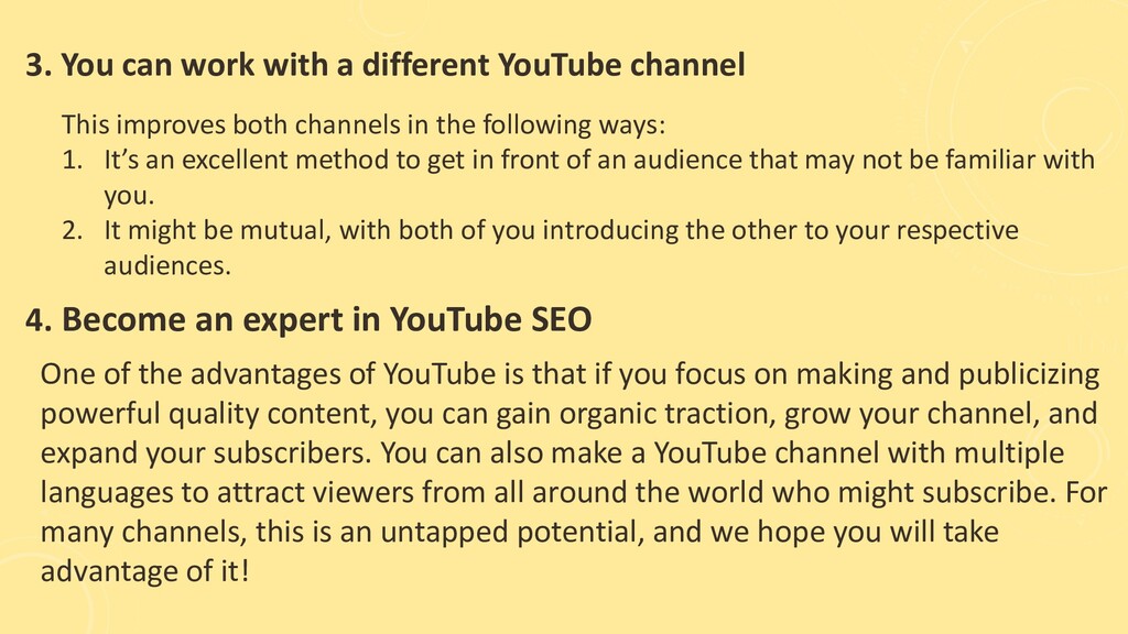 improves both channels in the following ways: 1. It’s an excellent method to get in front of an audience that may not be familiar with you. 2. It might be mutual, with both of you introducing the other to your respective audiences. 4. Become an expert in YouTube SEO One of the advantages of YouTube is that if you focus on making and publicizing powerful quality content, you can gain organic traction, grow your channel, and expand your subscribers. You can also make a YouTube channel with multiple languages to attract viewers from all around the world who might subscribe. For many channels, this is an untapped potential, and we hope you will take advantage of it!