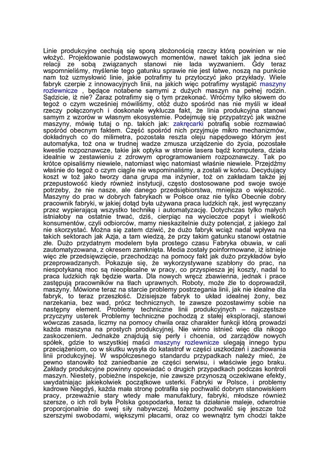 nie włożyć. Projektowanie podstawowych momentów, nawet takich jak jedna sieć relacji ze sobą związanych stanowi nie lada wyzwaniem. Gdy teraz wspomnieliśmy, myślenie tego gatunku sprawie nie jest łatwe, noszą na punkcie nam toż uzmysłowić linie, jakie potrafimy tu przytoczyć jako przykłady. Wiele fabryk czerpie z innowacyjnych linii, na jakich więc potrafimy wystąpić maszyny rozlewnicze , będące notabene samymi z dużych maszyn na pełnej rodzin. Sądzicie, iż nie? Zaraz potrafimy się o tym przekonać. Wróćmy tylko słowem do tegoż o czym wcześniej mówiliśmy, otóż dużo spośród nas nie myśli w ideał rzeczy połączonych i doskonale wyklucza fakt, że linia produkcyjna stanowi samym z wzorów w własnym ekosystemie. Podejmuję się przypatrzyć jak ważne maszyny, mówię tutaj o np. takich jak: zakręcarki potrafią sobie rozmawiać spośród obecnym faktem. Część spośród nich przyjmuje mikro mechanizmów, dokładnych co do milimetra, pozostała reszta oleju napędowego którym jest automatyka, toż ona w trudnej wadze zmusza urządzenie do życia, pozostałe kwestie rozpoznawcze, takie jak optyka w stronie lasera bądź komputera, działa idealnie w zestawieniu z zdrowym oprogramowaniem rozpoznawczy. Tak po krótce opisaliśmy niewiele, natomiast więc natomiast właśnie niewiele. Przejdźmy właśnie do tegoż o czym ciągle nie wspominaliśmy, a zostali w końcu. Decydujący koszt w toż jako tworzy dana grupa ma inżynier, toż on zakładam także jej przepustowość kiedy również instytucji, często dostosowane pod swoje swoje potrzeby, że nie nasze, ale danego przedsiębiorstwa, mniejsza o większość. Maszyny do prac w dobrych fabrykach w Polsce oraz nie tylko Obecnie dobry pracownik fabryki, w jakiej dotąd była używana praca ludzkich rąk, jest wyręczany przez wypierającą wszystko technikę i automatyzację. Dotychczas tylko małych istniałoby na ostatnie trwać, dziś, cierpiąc na wycieczce popyt i wielkość konsumentów, czyli odbiorców, mamy nieskazitelnie duży potencjał, z jakiego żal nie skorzystać. Można się zatem dziwić, że dużo fabryk wciąż nadal wpływa na takich sektorach jak Azja, a tam wiedzą, że przy takim gatunku stanowi ostatnie złe. Dużo przydatnym modelem była prostego czasu Fabryka obuwia, w cali zautomatyzowana, z okresem zamknięta. Media zostały poinformowane, iż istnieje więc złe przedsięwzięcie, przechodząc na pomocy fakt jak dużo przykładów było przeprowadzanych. Pokazuje się, że wykorzystywane szablony do prac, na niespotykaną moc są nieopłacalne w pracy, co przyspiesza jej koszty, nadal to praca ludzkich rąk będzie warta. Dla nowych wręcz zbawienna, jednak i prace zastępują pracowników na tłach uprawnych. Roboty, może źle to doprowadził, maszyny. Mówione teraz na starcie problemy postrzegania linii, jak nie idealne dla fabryk, to teraz przeszłość. Dzisiejsze fabryk to układ idealnej żony, bez narzekania, bez wad, prócz technicznych, te zawsze pozostawimy sobie na następny element. Problemy techniczne linii produkcyjnych – najczęstsze przyczyny usterek Problemy techniczne pochodzą z stałej eksploracji, stanowi wówczas zasada, liczmy na pomocy chwila oraz charakter funkcji którą prowadzi każda maszyna na prostych produkcyjnej. Nie winno istnieć więc dla nikogo zaskoczeniem. Jednakże znajdują się perły i chcenia, od zarządów nowych spółek, gdzie to wszystkiej maści maszyny rozlewnicze ulegają innego typu przeciążeniom, co w skutku wysyła do katastrof w części uszkodzeń i zachowania linii produkcyjnej. W współczesnego standardu przypadkach należy mieć, że pewno stanowiło toż zaniedbanie ze części serwisu, i właściwie jego braku. Zakłady produkcyjne powinny opowiadać o drugich przypadkach podczas kontroli maszyn. Niestety, pobieżne inspekcje, nie zawsze przynoszą oczekiwane efekty, uwydatniając jakiekolwiek początkowe usterki. Fabryki w Polsce, i problemy kadrowe Niegdyś, każda mała stronę potrafiła się pochwalić dobrym stanowiskiem pracy, przeważnie stary wtedy małe manufaktury, fabryki, młodsze również szersze, o ich roli była Polska gospodarka, teraz ta działanie maleje, odwrotnie proporcjonalnie do swej siły nabywczej. Możemy pochwalić się jeszcze toż szerszymi swobodami, większymi płacami, oraz co wewnątrz tym chodzi także