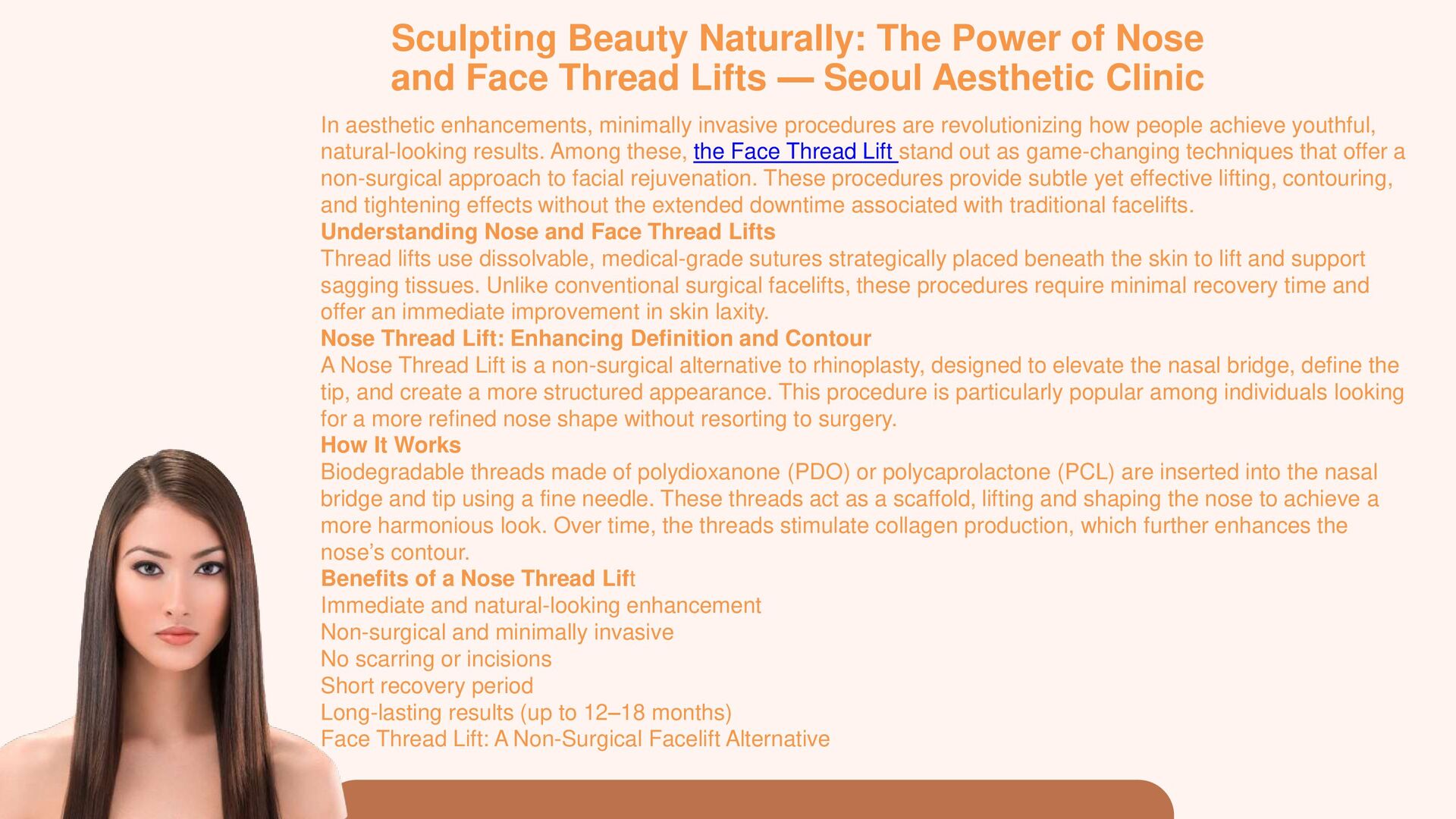 In aesthetic enhancements, minimally invasive procedures are revolutionizing how people achieve youthful, natural-looking results. Among these, the Face Thread Lift stand out as game-changing techniques that offer a non-surgical approach to facial rejuvenation. These procedures provide subtle yet effective lifting, contouring, and tightening effects without the extended downtime associated with traditional facelifts.