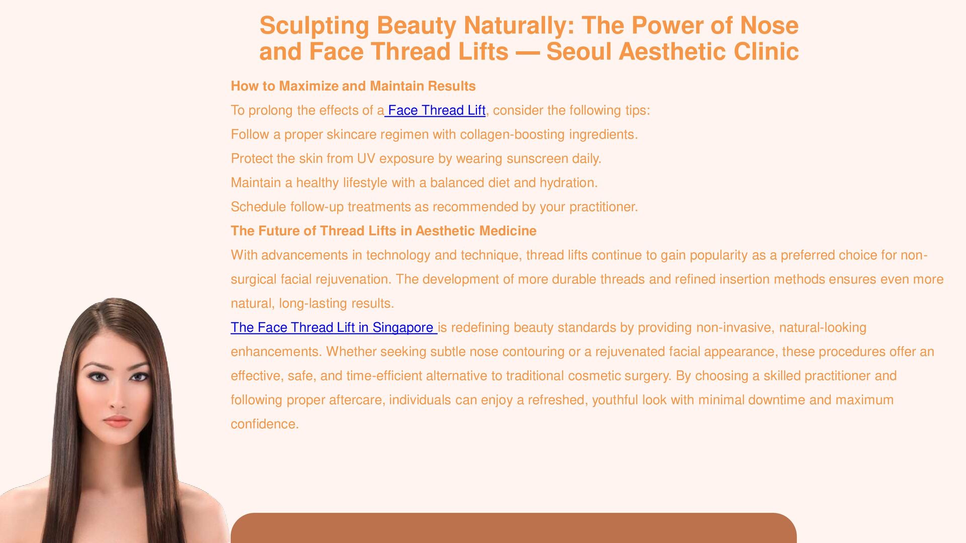 The Face Thread Lift in Singapore is redefining beauty standards by providing non-invasive, natural-looking enhancements. Whether seeking subtle nose contouring or a rejuvenated facial appearance, these procedures offer an effective, safe, and time-efficient alternative to traditional cosmetic surgery. By choosing a skilled practitioner and following proper aftercare, individuals can enjoy a refreshed, youthful look with minimal downtime and maximum confidence.