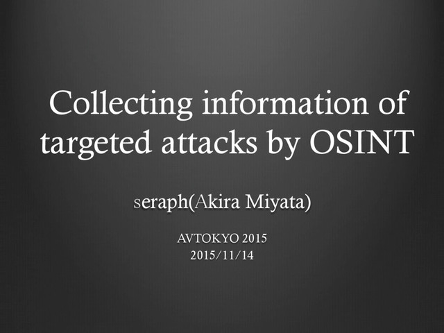 Points It is difficult for the information to be checked for correct. For example, it is difficult to understand only malware information. So we need to investigate combined mails, tools, malwares and C2 servers, etc. When investigating, there is a need to be aware of remaining log. When the sample is large, such as malware, survey of accuracy is improved.