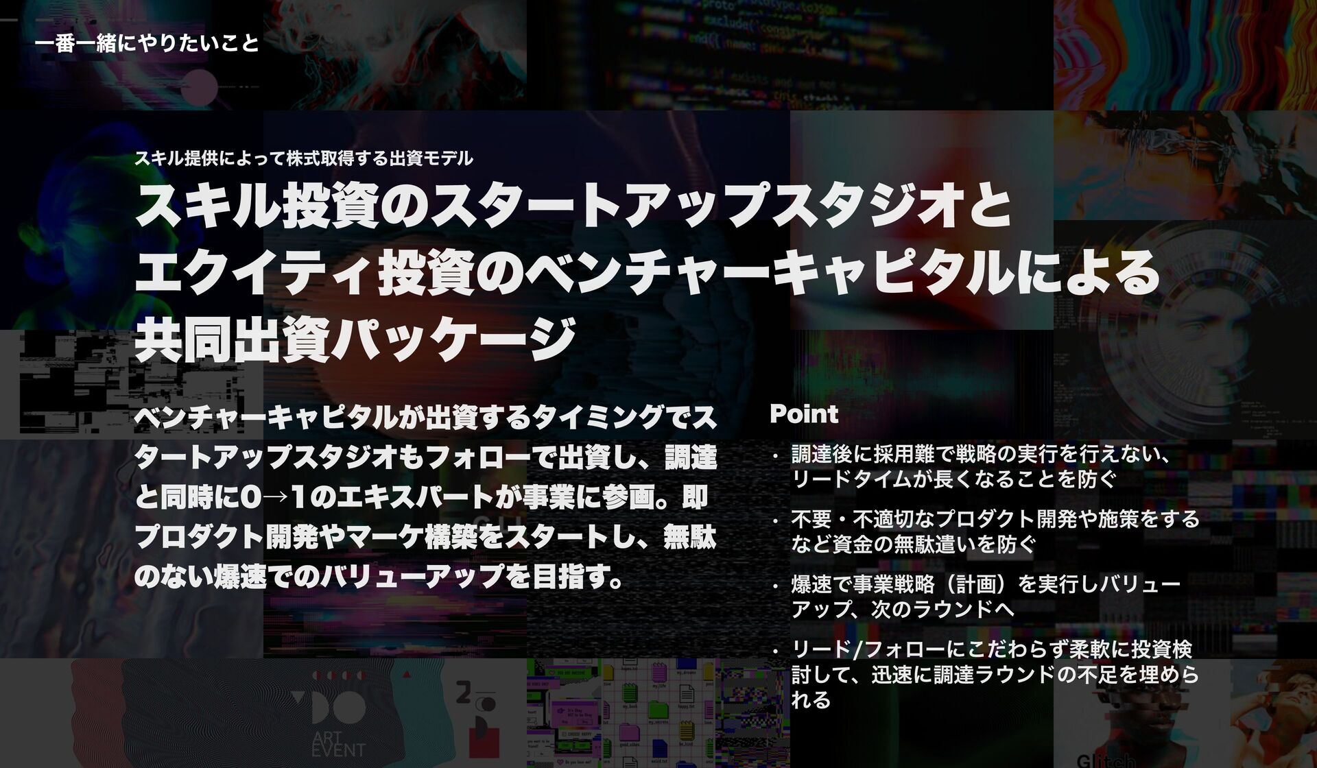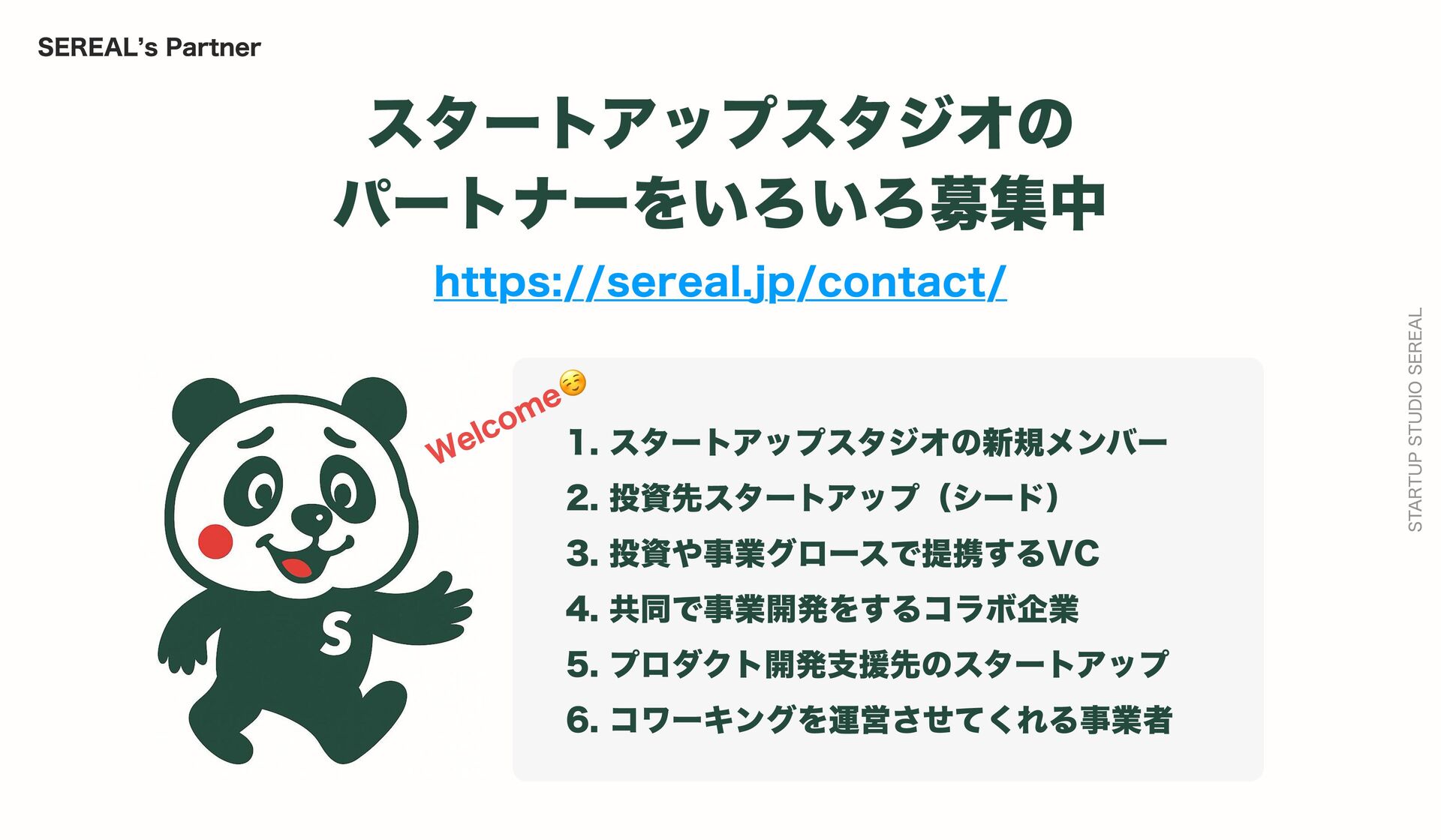 SEREALは、PMFの確度と速度を上げるため、BeforePMFに特化した事業・プロダクト・マーケティングのエキスパートが「共闘」「共創」「創業」「投資」で良質なスタートアップを量産するスタートアップスタジオです。
