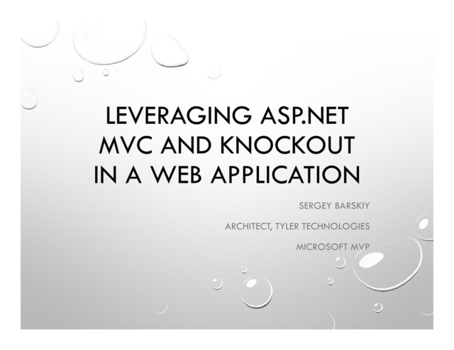 This presentation is all about leveraging the power of data binding from knockout and traditional ASP.NET MVC views with unobtrusive validation. We will see how we can inject knockout binding using custom templates, while at the same time writing smaller, cleaner views. We will see how we can avoid post backs with jQuery and view model to optimize user experience and performance with small amounts of JavaScript. We will look at list based UI, using jqGrid as an example of a presentation layer. At the end, we will have a working application with a query and an edit screen, establishing a pattern of writing large applications with MVC and Knockout.