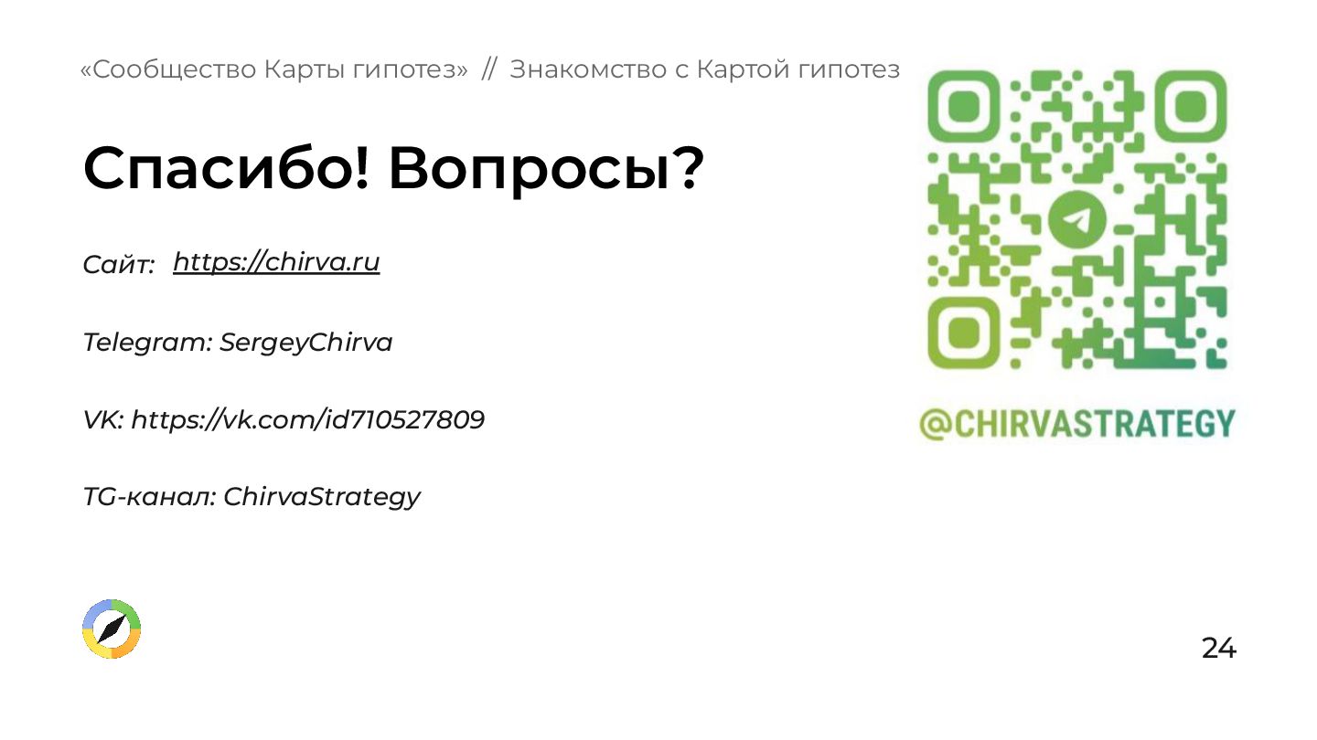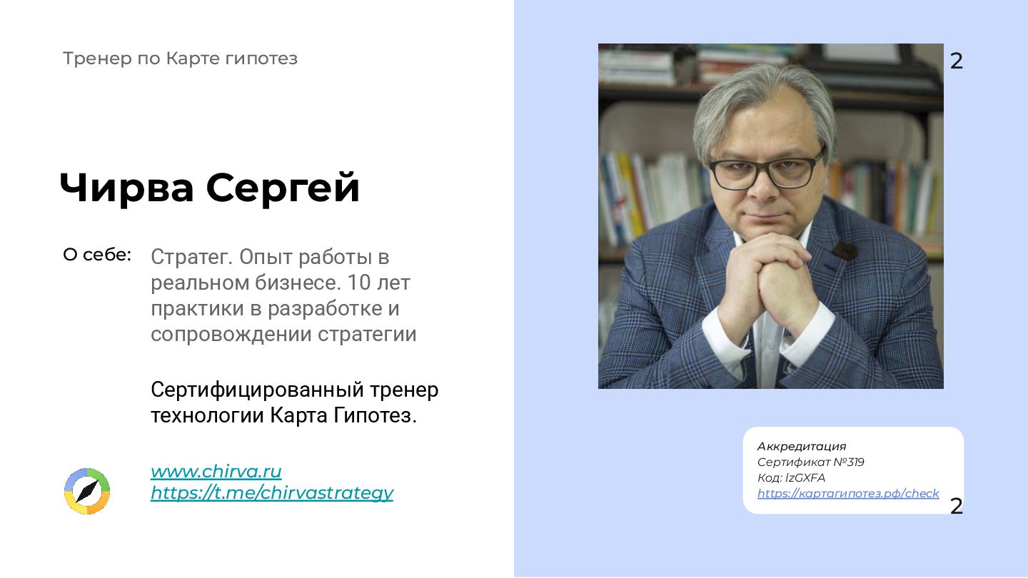 реальном бизнесе. 10 лет практики в разработке и сопровождении стратегии Сертифицированный тренер технологии Карта Гипотез. www.chirva.ru https://t.me/chirvastrategy О себе: Аккредитация Сертификат №319 Код: lzGXFA https://картагипотез.рф/check 2 2