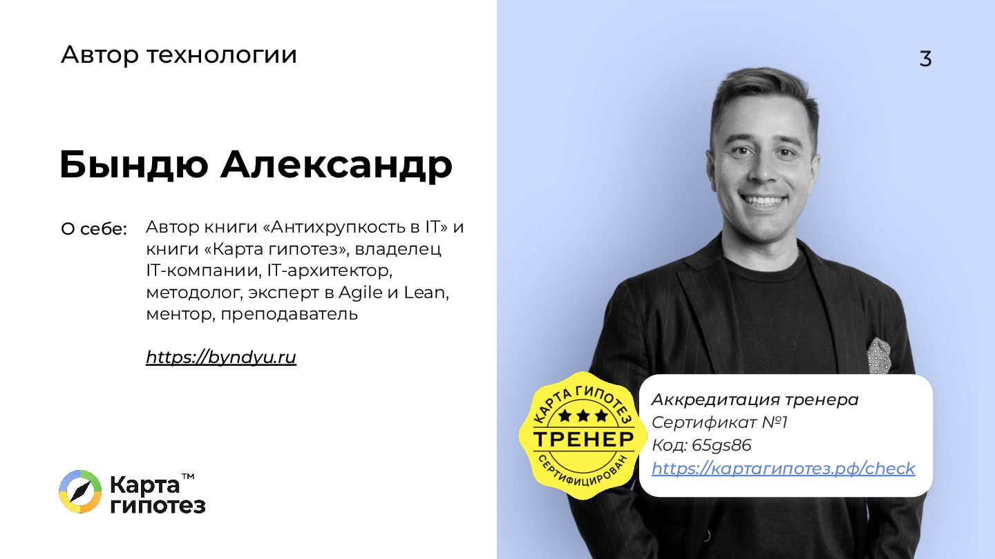 книги «Карта гипотез», владелец IT-компании, IT-архитектор, методолог, эксперт в Agile и Lean, ментор, преподаватель https://byndyu.ru О себе: 3 Аккредитация тренера Сертификат №1 Код: 65gs86 https://картагипотез.рф/check