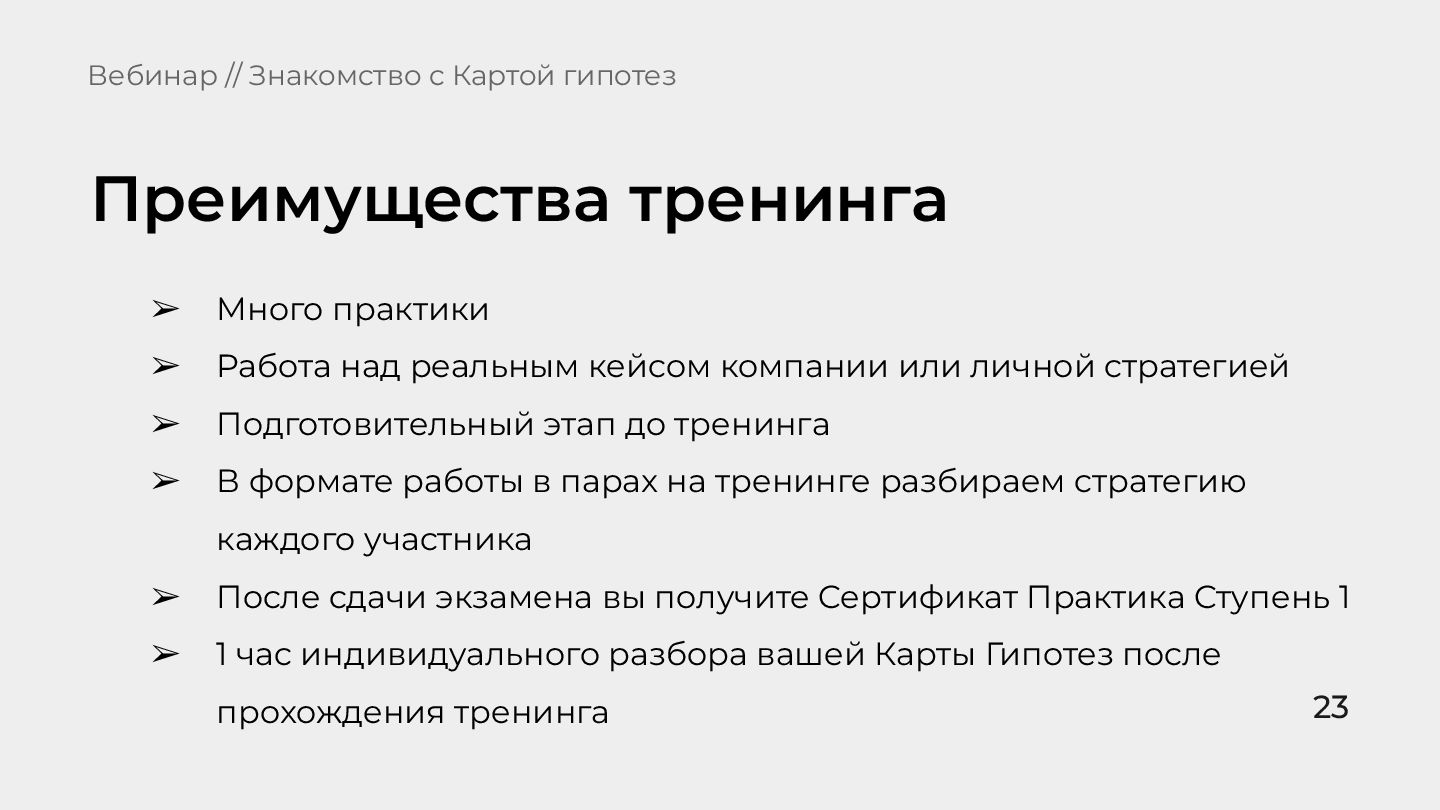 Картой гипотез ➢ Много практики ➢ Работа над реальным кейсом компании или личной стратегией ➢ Подготовительный этап до тренинга ➢ В формате работы в парах на тренинге разбираем стратегию каждого участника ➢ После сдачи экзамена вы получите Сертификат Практика Ступень 1 ➢ 1 час индивидуального разбора вашей Карты Гипотез после прохождения тренинга