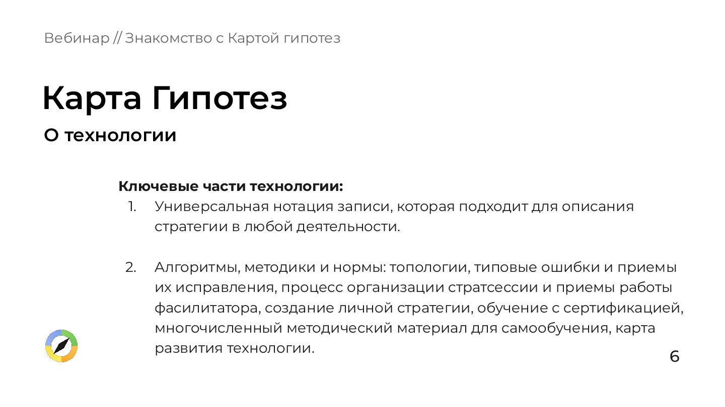 подходит для описания стратегии в любой деятельности. 2. Алгоритмы, методики и нормы: топологии, типовые ошибки и приемы их исправления, процесс организации стратсессии и приемы работы фасилитатора, создание личной стратегии, обучение с сертификацией, многочисленный методический материал для самообучения, карта развития технологии. 6 Вебинар // Знакомство с Картой гипотез О технологии
