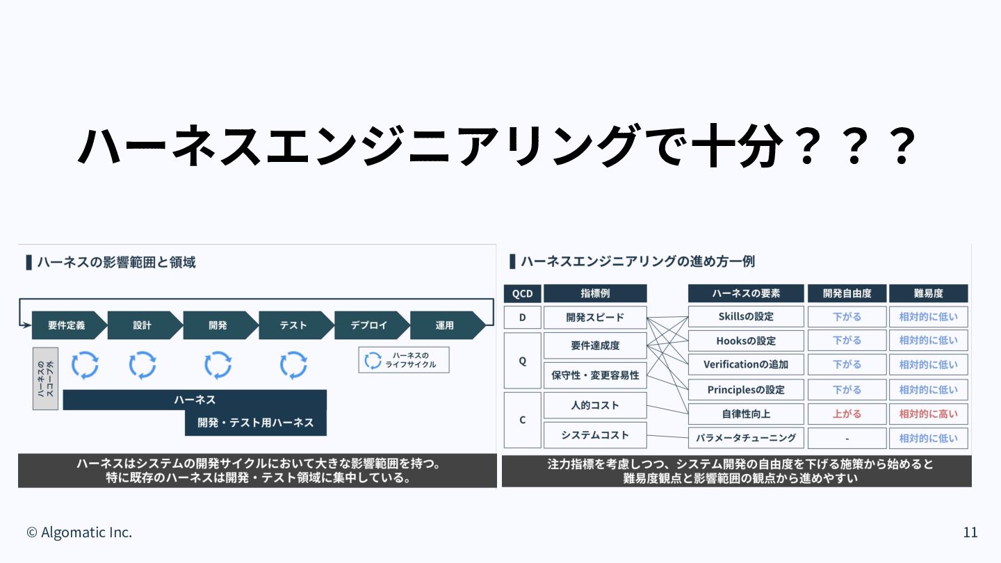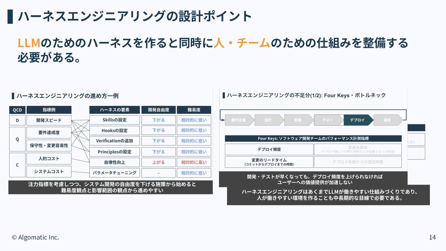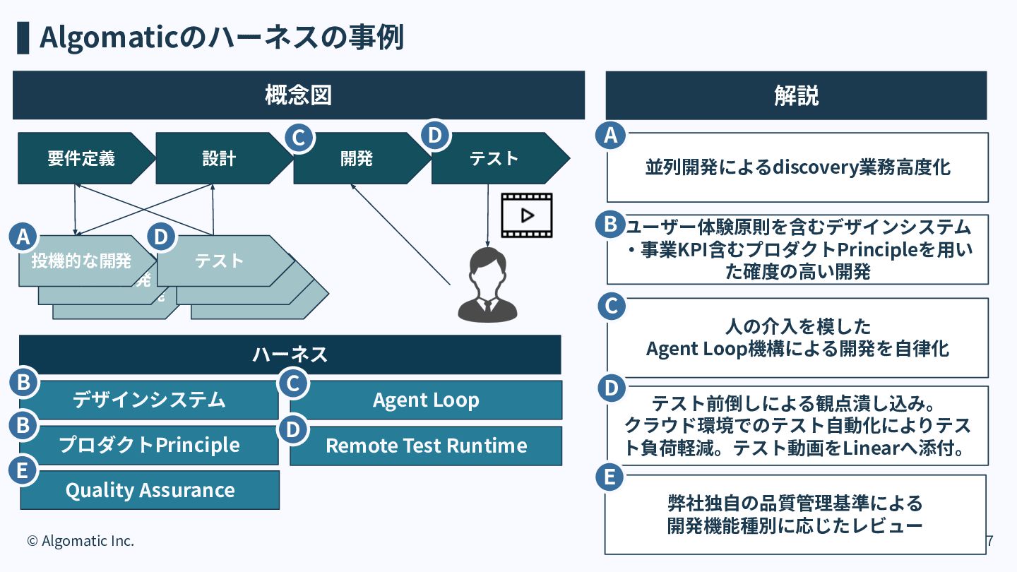 設計 開発 テスト 要件定義 設計 開発 テスト 投機的な開発 テスト ハーネス 並列開発によるdiscovery業務⾼度化 デザインシステム ⼈の介⼊を模した Agent Loop機構による開発を⾃律化 Agent Loop A A 概念図 解説 D D B プロダクトPrinciple B C C Remote Test Runtime D ユーザー体験原則を含むデザインシステム ‧事業KPI含むプロダクトPrincipleを⽤い た確度の⾼い開発 B C テスト前倒しによる観点潰し込み。 クラウド環境でのテスト⾃動化によりテス ト負荷軽減。テスト動画をLinearへ添付。 D Quality Assurance E 弊社独⾃の品質管理基準による 開発機能種別に応じたレビュー E