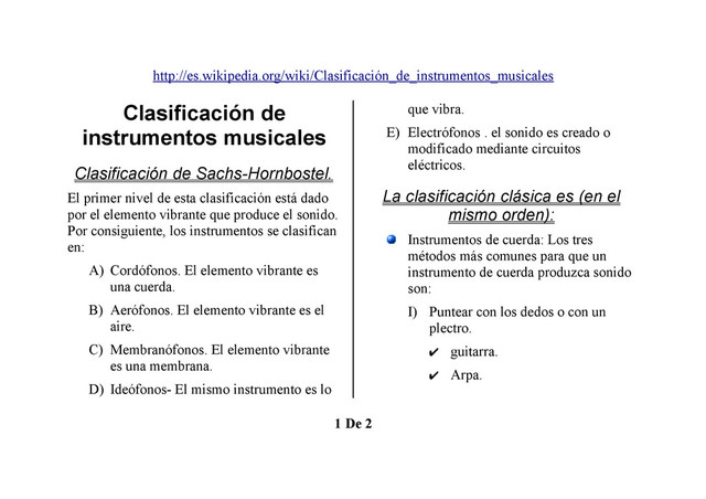 nivel de esta clasificación está dado por el elemento vibrante que produce el sonido. Por consiguiente, los instrumentos se clasifican en: A) Cordófonos. El elemento vibrante es una cuerda. B) Aerófonos. El elemento vibrante es el aire. C) Membranófonos. El elemento vibrante es una membrana. D) Ideófonos- El mismo instrumento es lo que vibra. E) Electrófonos . el sonido es creado o modificado mediante circuitos eléctricos. La clasificación clásica es (en el mismo orden): Instrumentos de cuerda: Los tres métodos más comunes para que un instrumento de cuerda produzca sonido son: I) Puntear con los dedos o con un plectro. ✔ guitarra. ✔ Arpa. 1 De 2