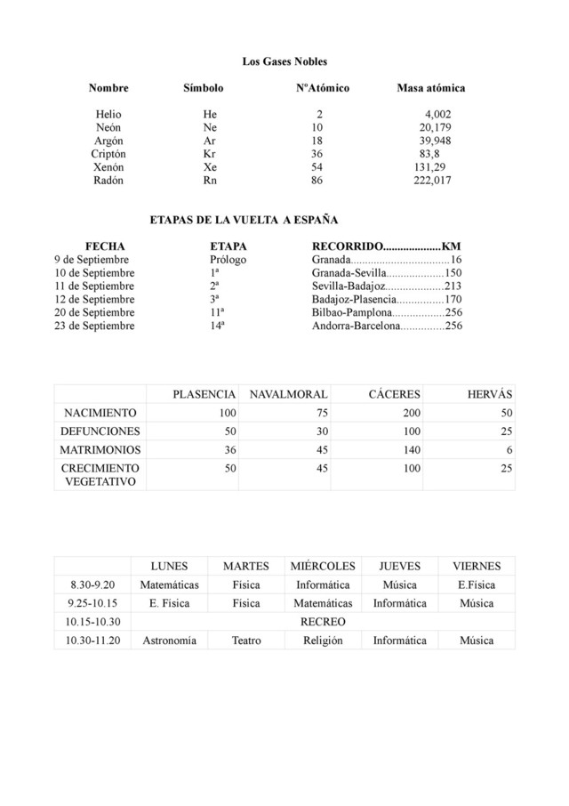 2 4,002 Neón Ne 10 20,179 Argón Ar 18 39,948 Criptón Kr 36 83,8 Xenón Xe 54 131,29 Radón Rn 86 222,017 ETAPAS DE LA VUELTA A ESPAÑA FECHA ETAPA RECORRIDO....................KM 9 de Septiembre Prólogo Granada..................................16 10 de Septiembre 1ª Granada-Sevilla....................150 11 de Septiembre 2ª Sevilla-Badajoz....................213 12 de Septiembre 3ª Badajoz-Plasencia................170 20 de Septiembre 11ª Bilbao-Pamplona..................256 23 de Septiembre 14ª Andorra-Barcelona...............256 PLASENCIA NAVALMORAL CÁCERES HERVÁS NACIMIENTO 100 75 200 50 DEFUNCIONES 50 30 100 25 MATRIMONIOS 36 45 140 6 CRECIMIENTO VEGETATIVO 50 45 100 25 LUNES MARTES MIÉRCOLES JUEVES VIERNES 8.30-9.20 Matemáticas Física Informática Música E.Física 9.25-10.15 E. Física Física Matemáticas Informática Música 10.15-10.30 RECREO 10.30-11.20 Astronomía Teatro Religión Informática Música