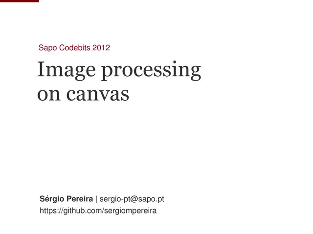 Why do it in the browser? : current applications. 3. How do we accomplish this? The canvas element and its rendering context. Geometric operations on an image : scale, crop and rotation. 4. Pixel manipulation The ImageData object 5. Filters 6. Pixel displacement (just a taste of it) 7. Optimization and performance 8. Libraries