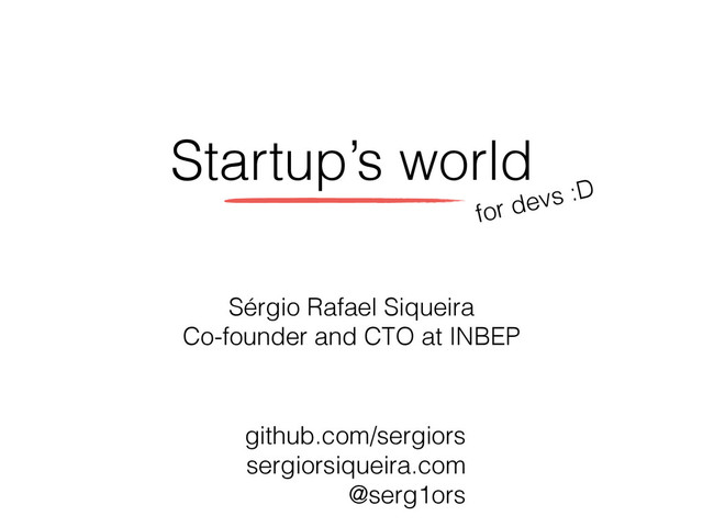 Startup’s world github.com/sergiors sergiorsiqueira.com @serg1ors Sérgio Rafael Siqueira Co-founder and