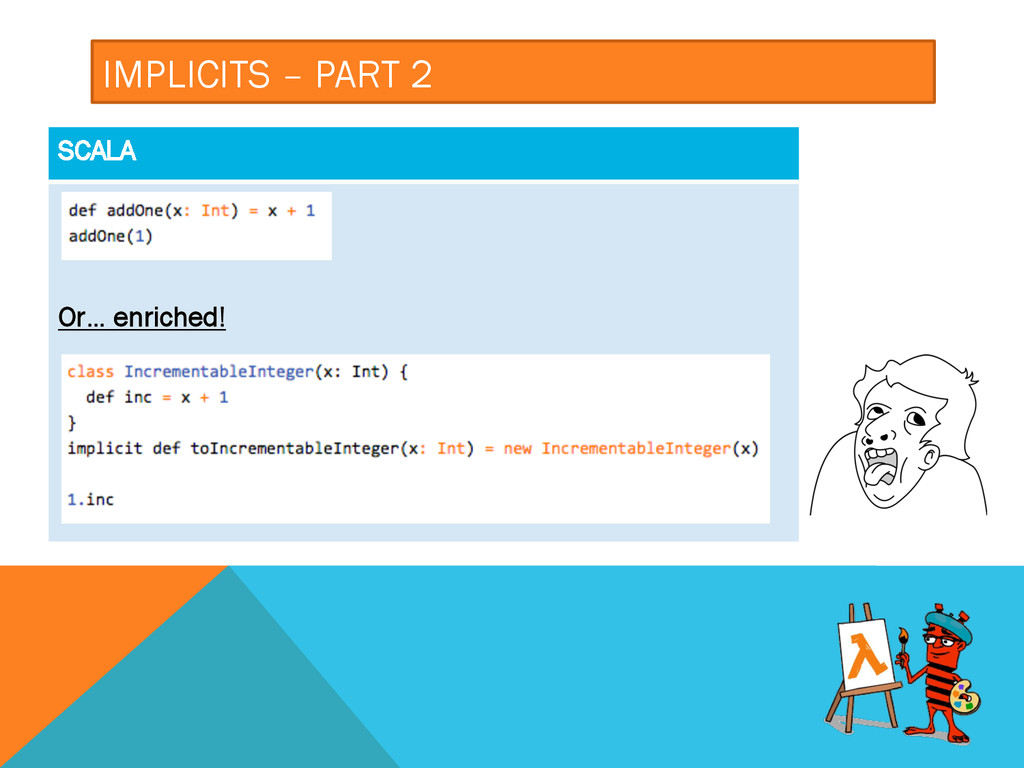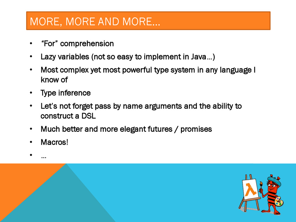 (not so easy to implement in Java…) • Most complex yet most powerful type system in any language I know of • Type inference • Let’s not forget pass by name arguments and the ability to construct a DSL • Much better and more elegant futures / promises • Macros! • …