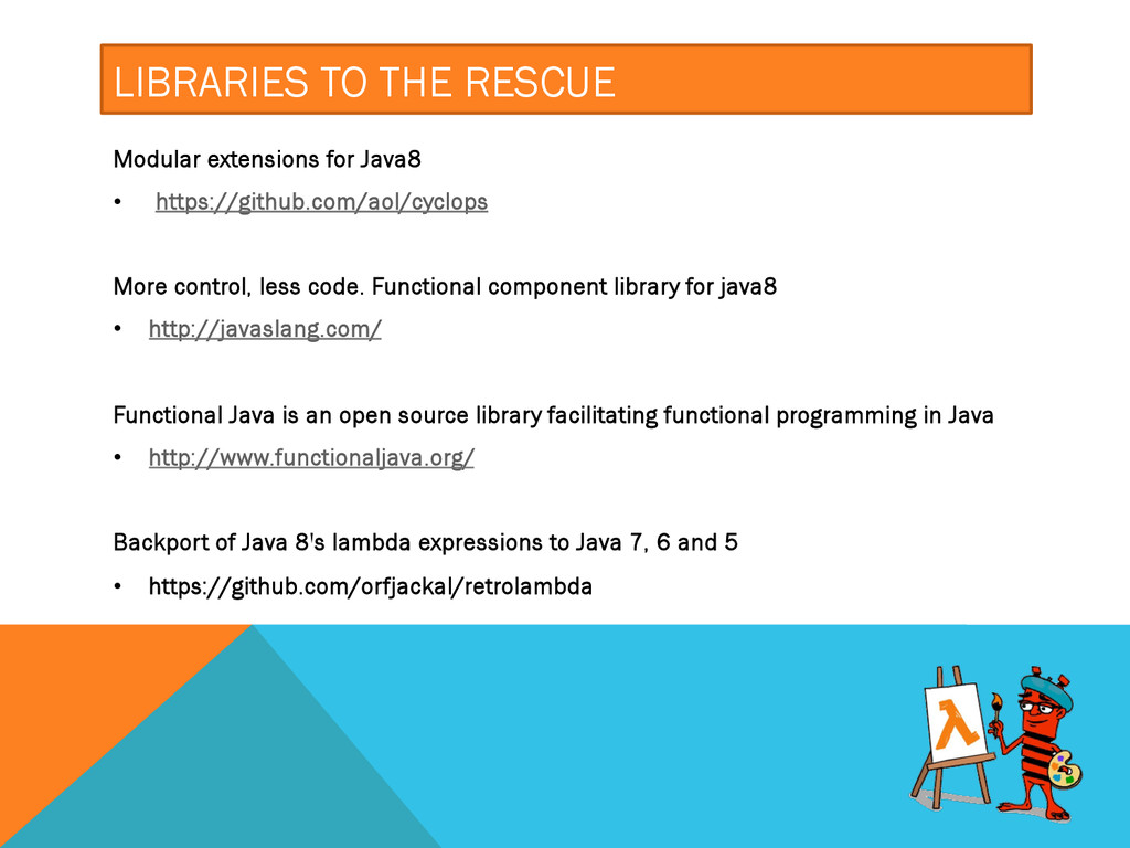 More control, less code. Functional component library for java8 • http://javaslang.com/ Functional Java is an open source library facilitating functional programming in Java • http://www.functionaljava.org/ Backport of Java 8's lambda expressions to Java 7, 6 and 5 • https://github.com/orfjackal/retrolambda