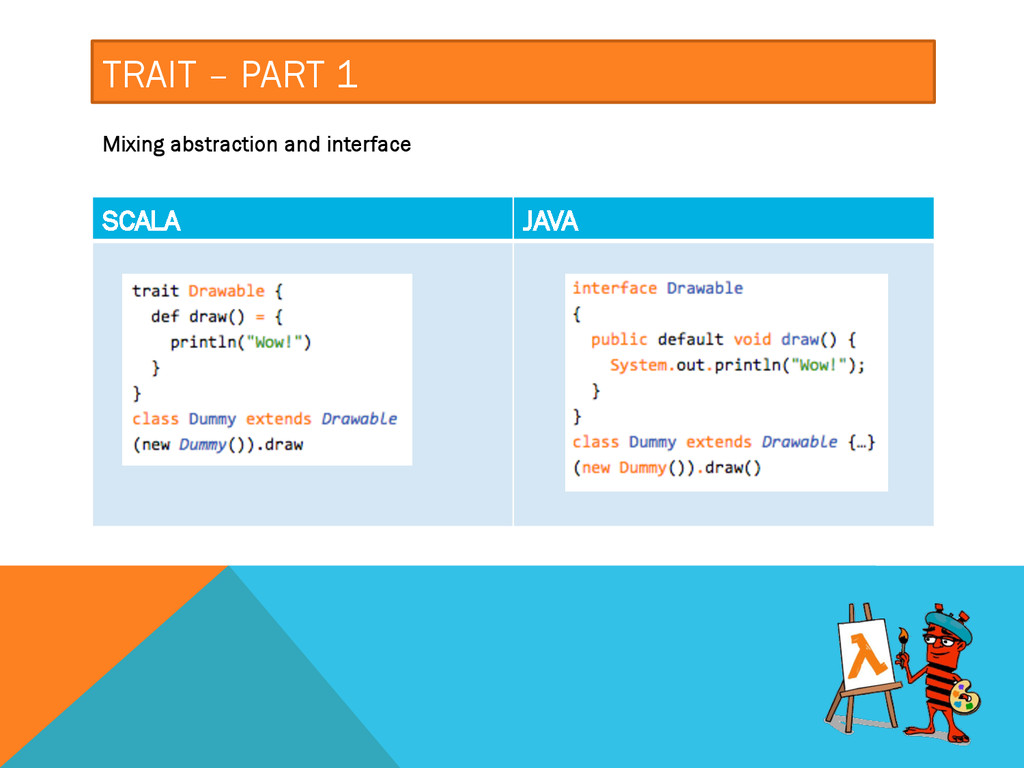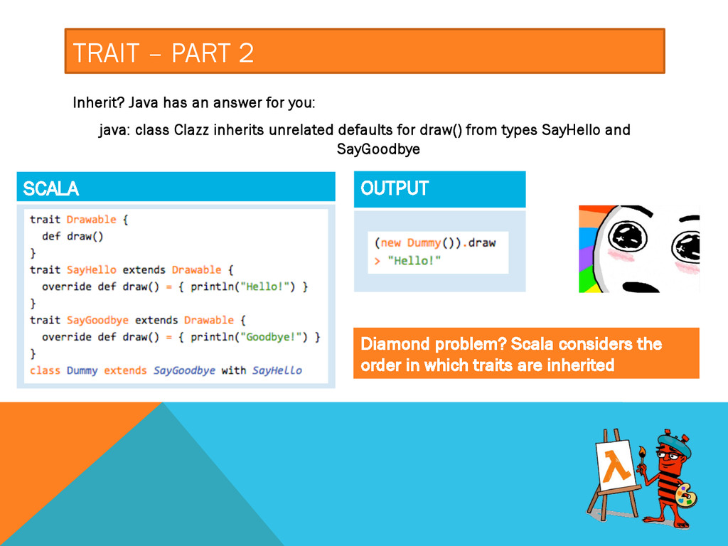 you: java: class Clazz inherits unrelated defaults for draw() from types SayHello and SayGoodbye SCALA OUTPUT Diamond problem? Scala considers the order in which traits are inherited