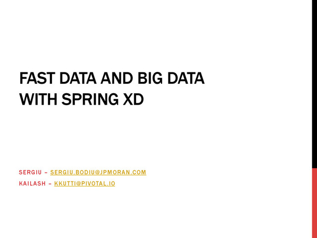 with SPRING XD • How to BUILD fast applications • Data Ingestion • Taps • Processors • Sinks • Batch Jobs, Workflow Orchestration and Export • Real-Time Analytics
