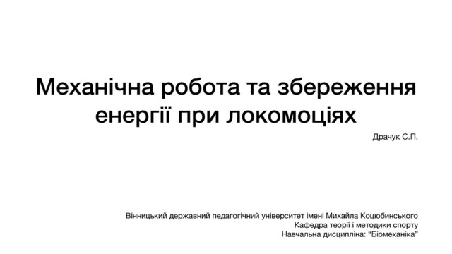 формулою: рек = , де рек - коефіцієнт рекуперації, - квазімеханічна робота, – повна механічна енергія біоланок. Якщо коефіцієнт рекуперації знаходиться в межах від 0 до 0,3, то коефіцієнт низький, енергія в системі не зберігається, тіло рухається не економно; від 0,3 до 0,6 – коефіцієнт середній, енергія зберігається; від 0,6 до 0,9 – високий коефіцієнт, енергія в системі зберігається, рух виконується економно. K wKM − ∑ Δϵi wKM K wKM ∑ Δϵi