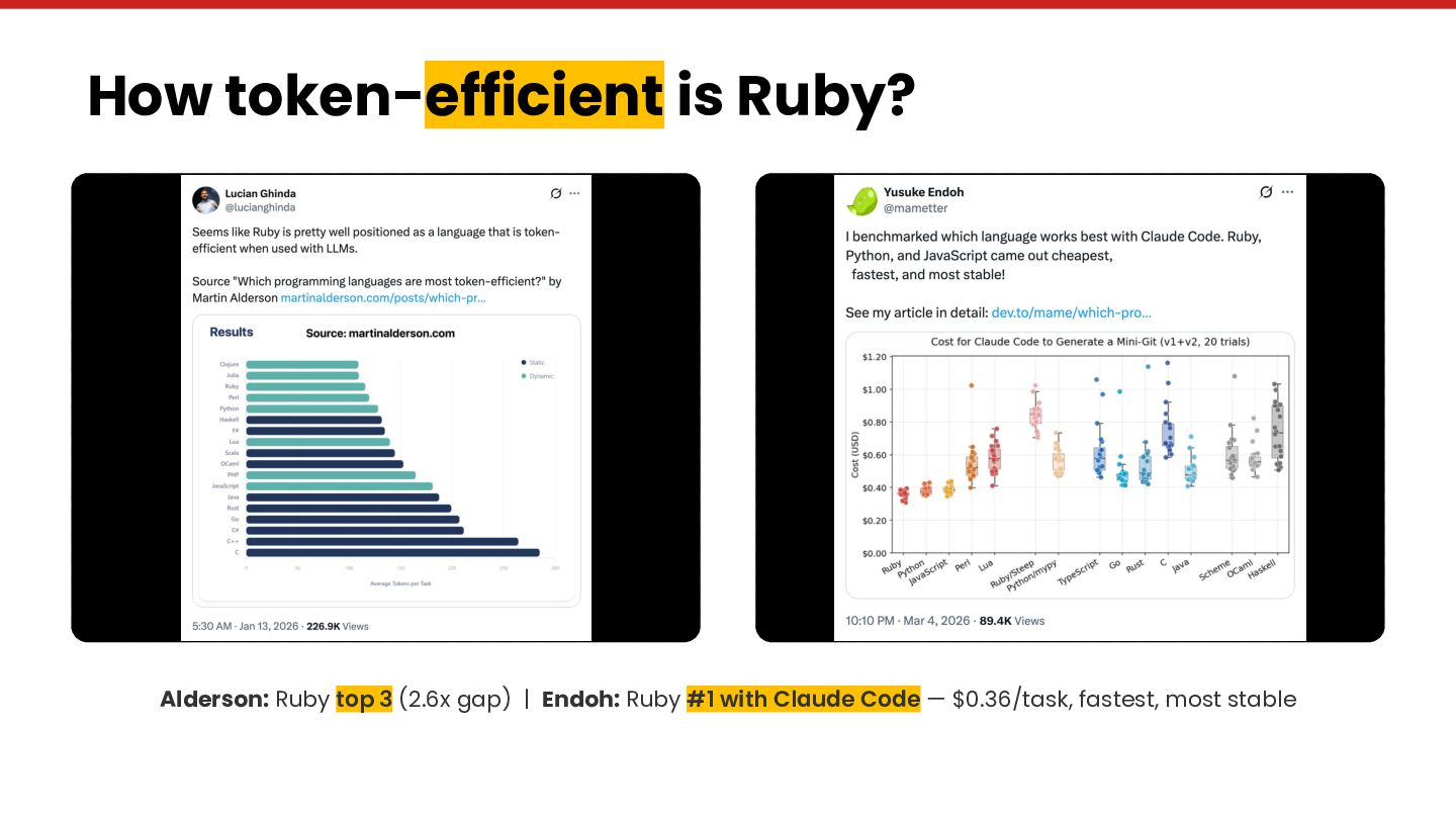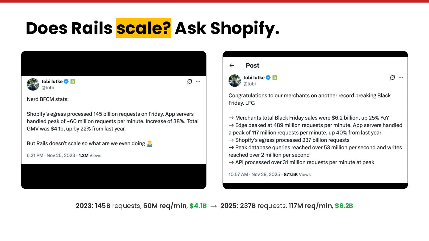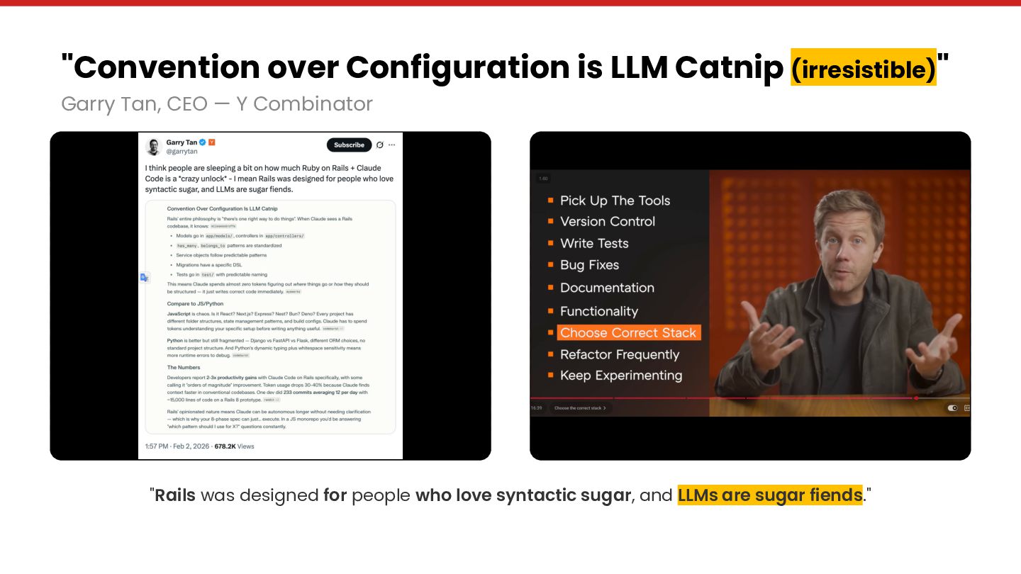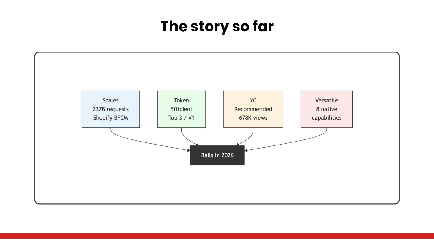 Along the way: Shopify's 237 billion BFCM requests, Ruby's #1 token efficiency with Claude Code, Y Combinator calling convention-over-configuration "LLM catnip," and a modularity-vs-deployment quadrant that reframes the monolith debate
