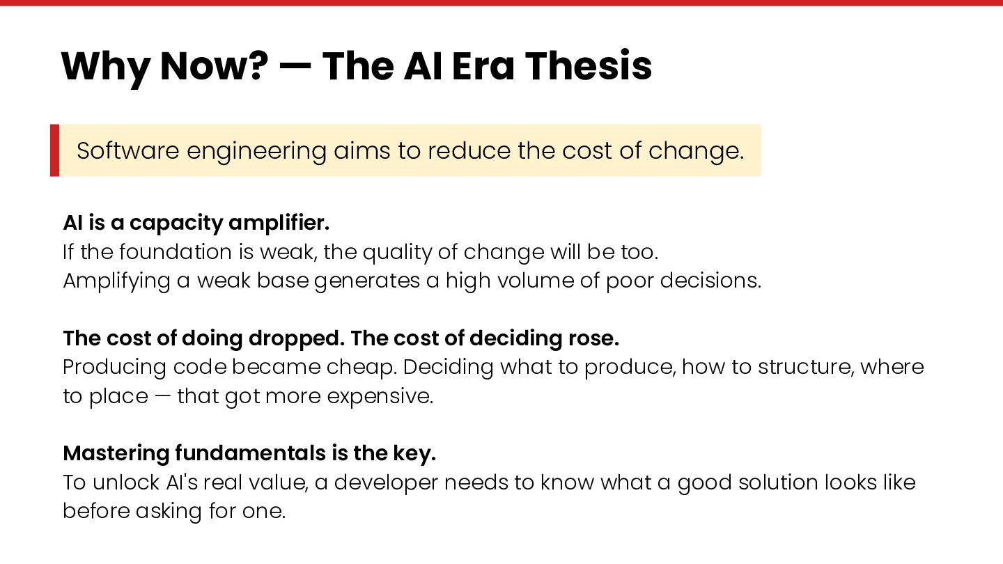 We examine why AI is a capacity amplifier that makes fundamentals more valuable, not less. Why the cost of producing code dropped while the cost of deciding rose. And why orthogonality, unified naming, resource discipline, and named