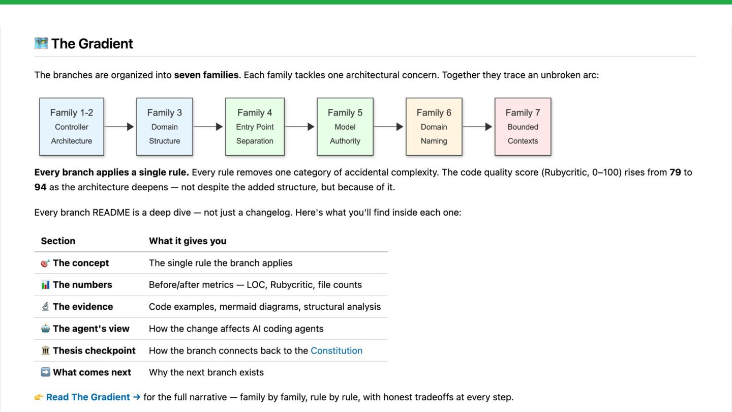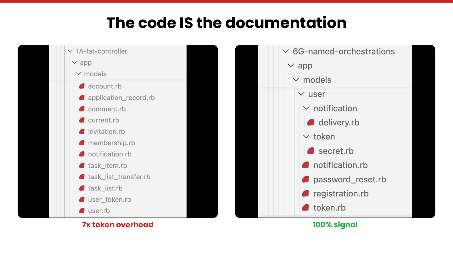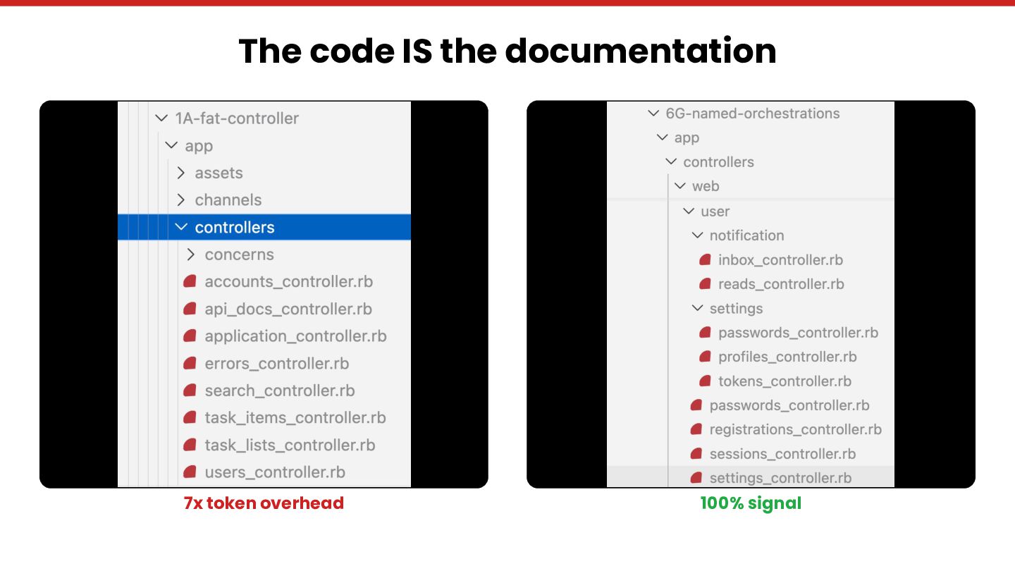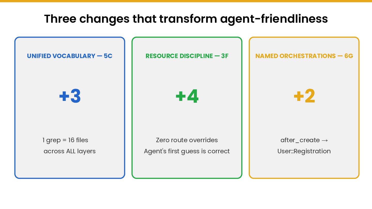 Through Rails Whey — an open-source project with 28 git branches evolving the same Rails application from fat controllers to bounded contexts — we measure agent-friendliness across five dimensions: context window cost, discoverability,