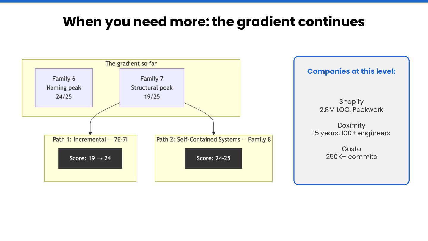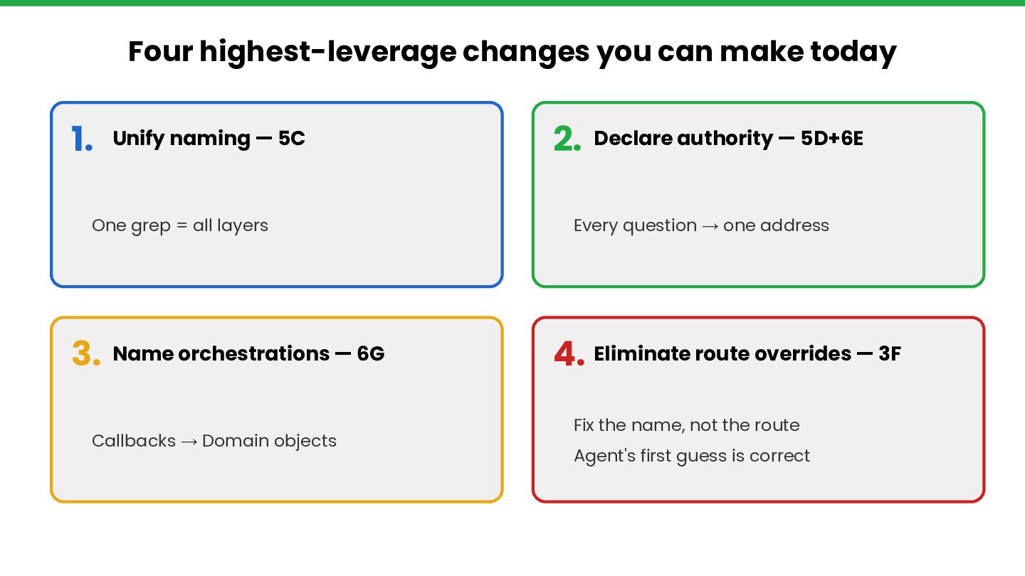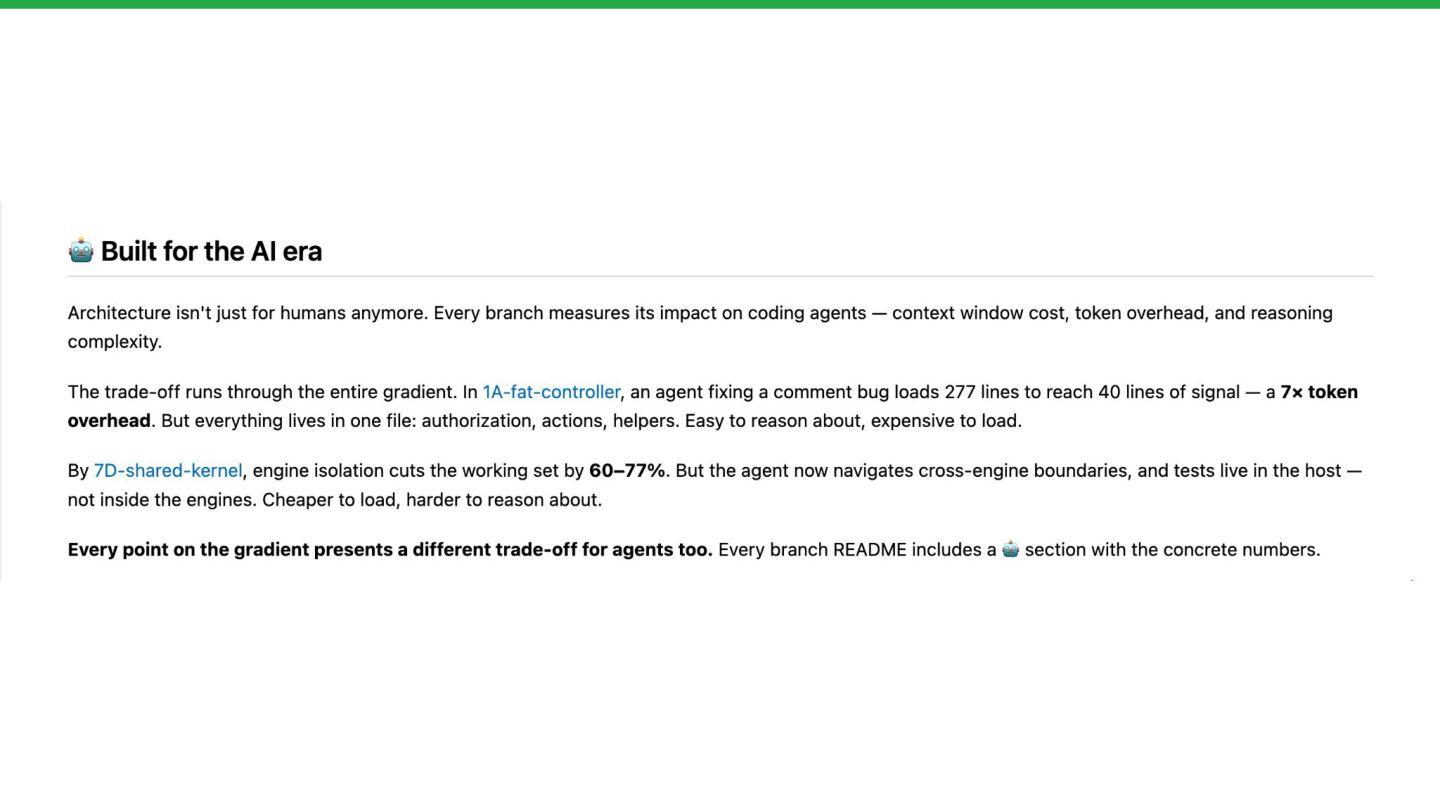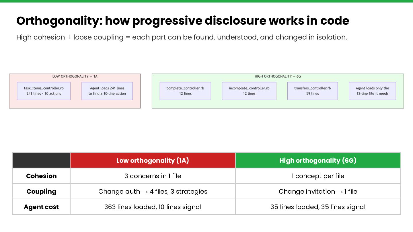 Through Rails Whey — an open-source project with 28 git branches evolving the same Rails application from fat controllers to bounded contexts — we measure agent-friendliness across five dimensions: context window cost, discoverability,