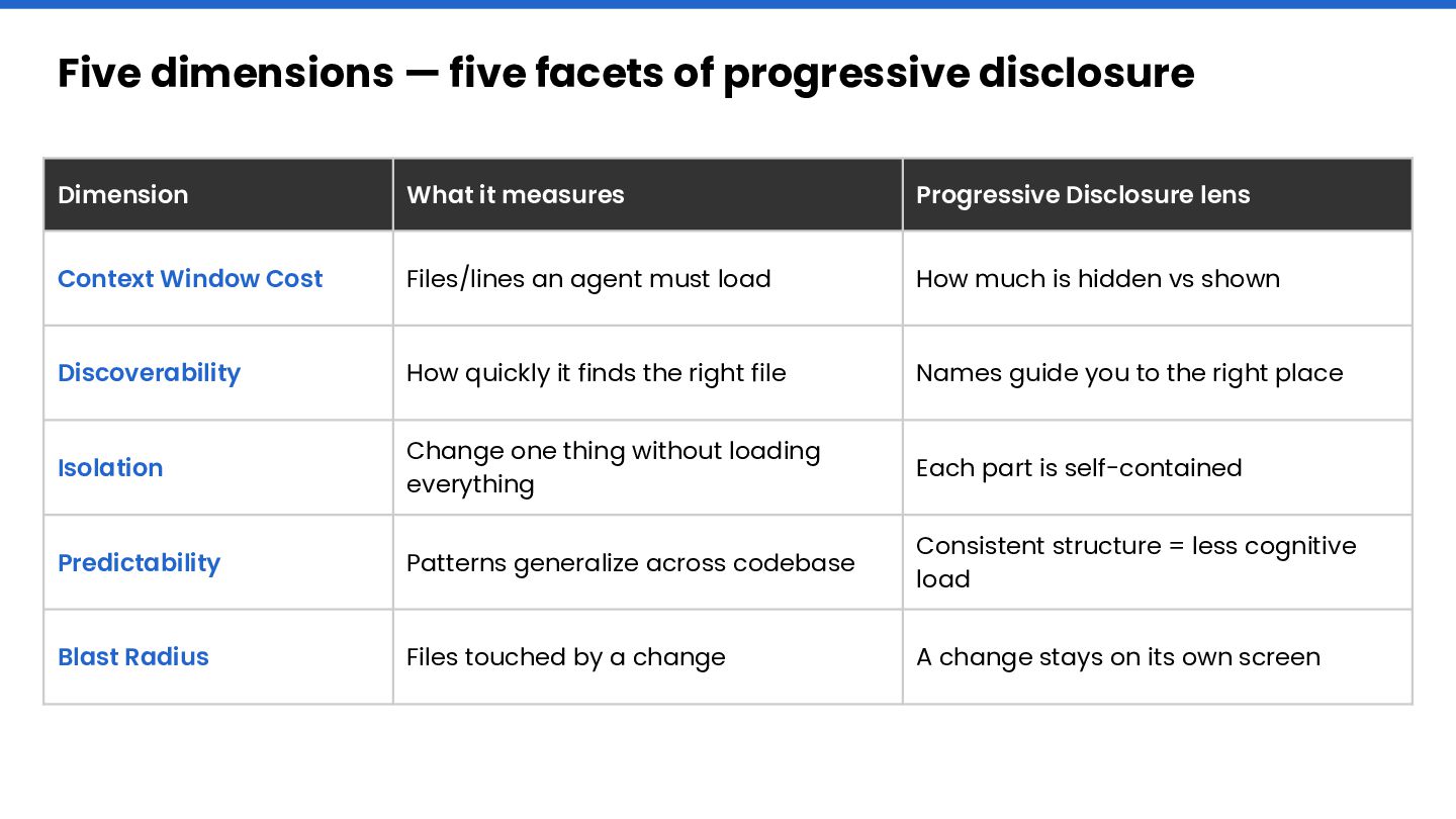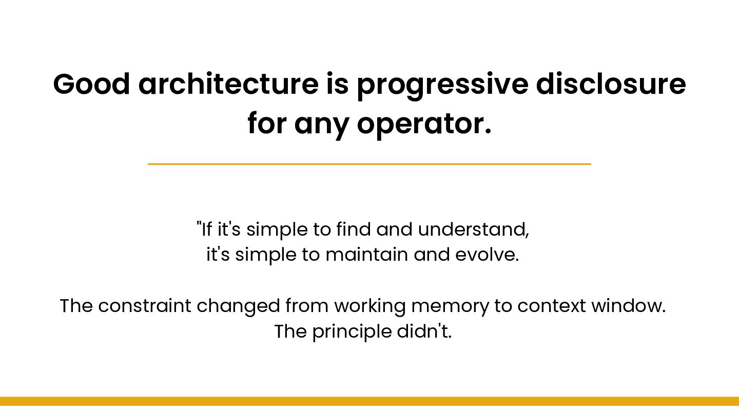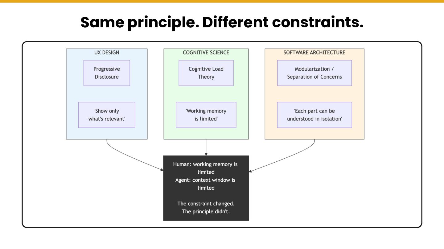 This talk introduces progressive disclosure as the unifying principle connecting UX design, cognitive science, and software architecture. The constraint changed from working memory to context window. The principle didn't.