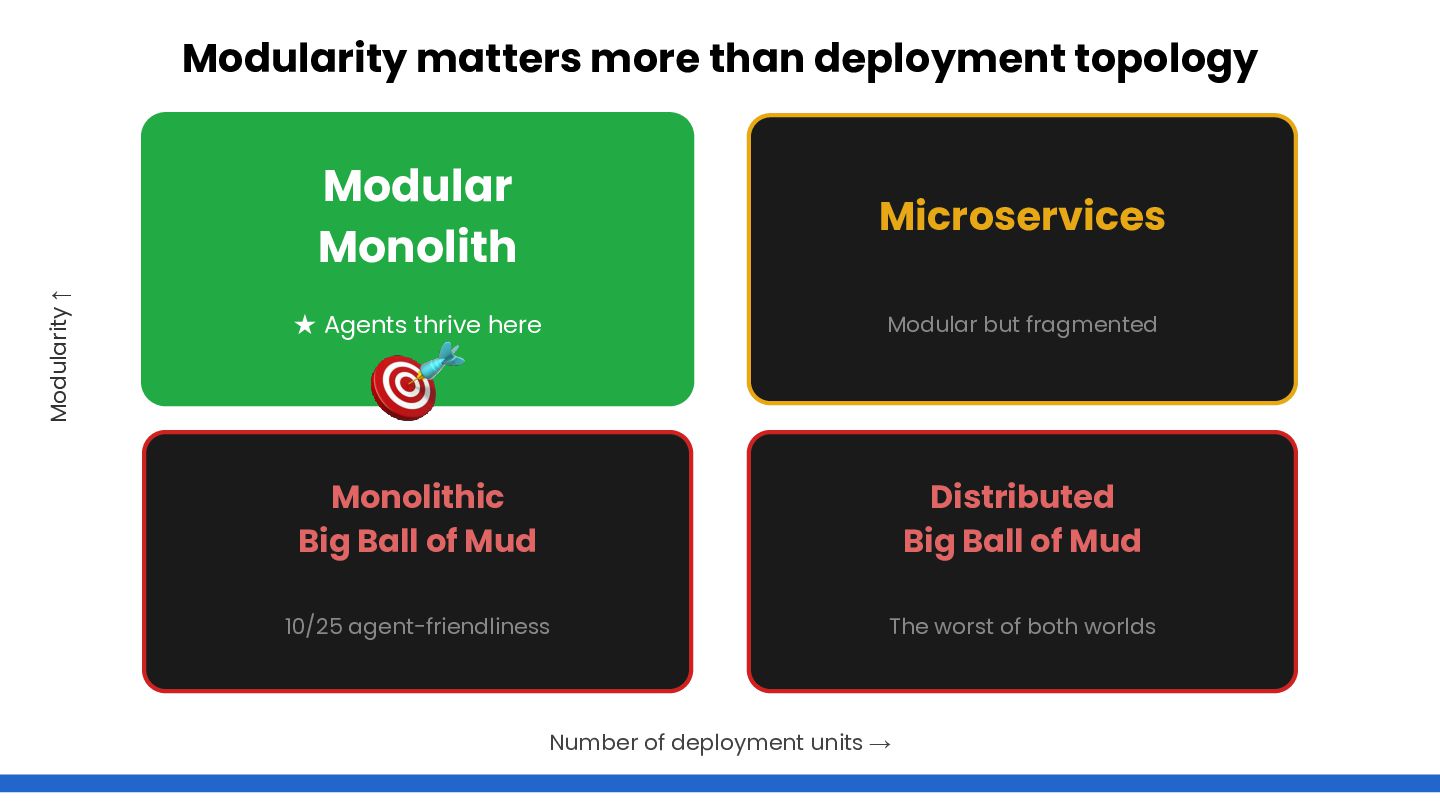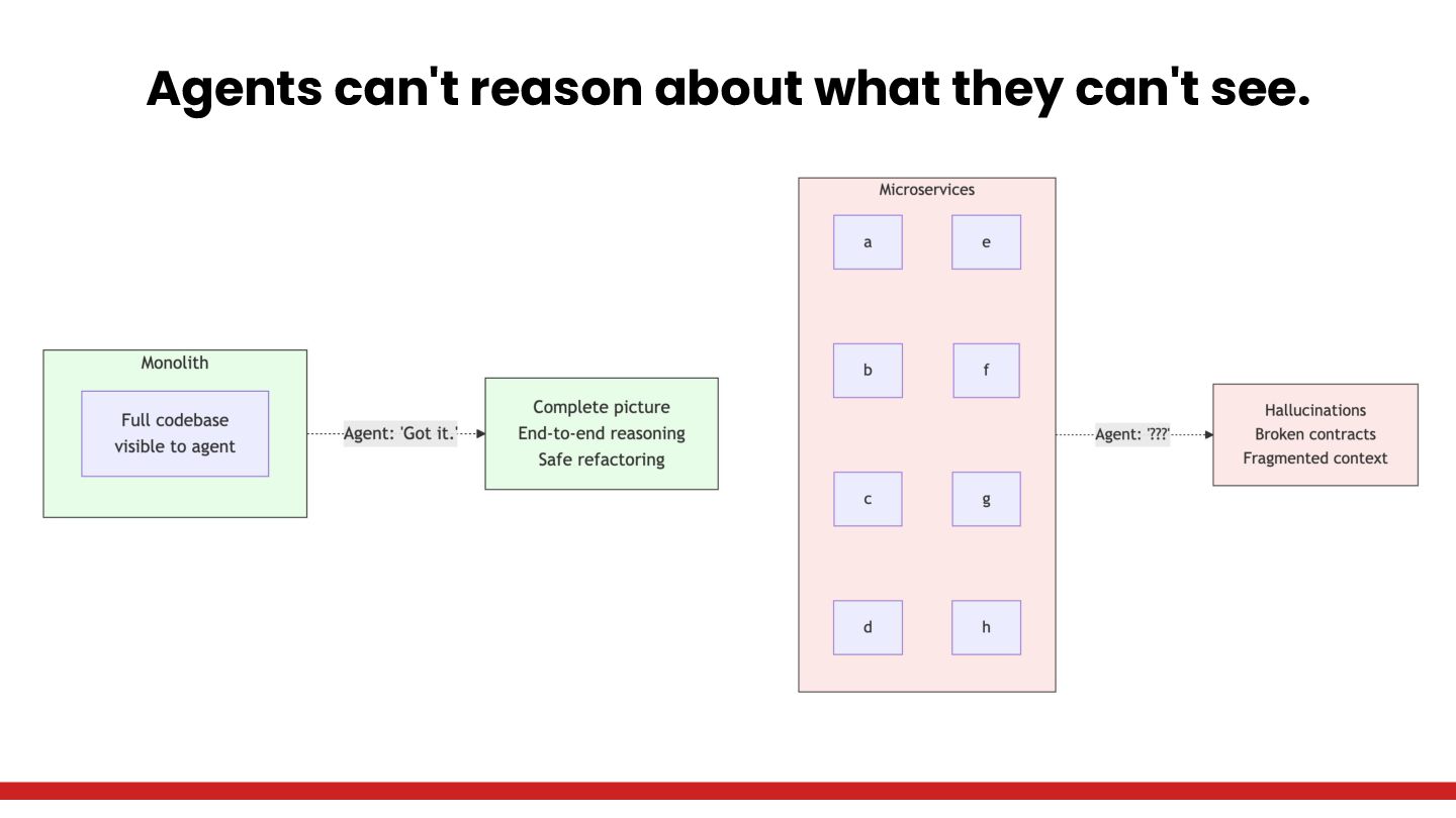 AI agents don't reason about what they can't see. Microservices fragment context across repositories; modular monoliths keep the entire solution accessible — for humans and agents alike.