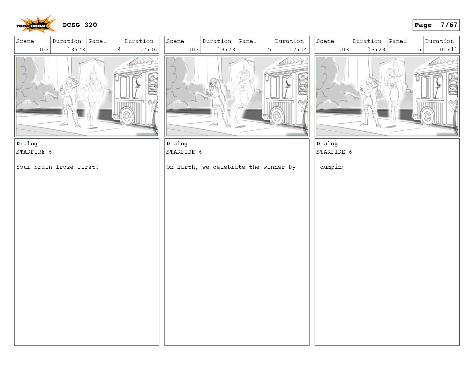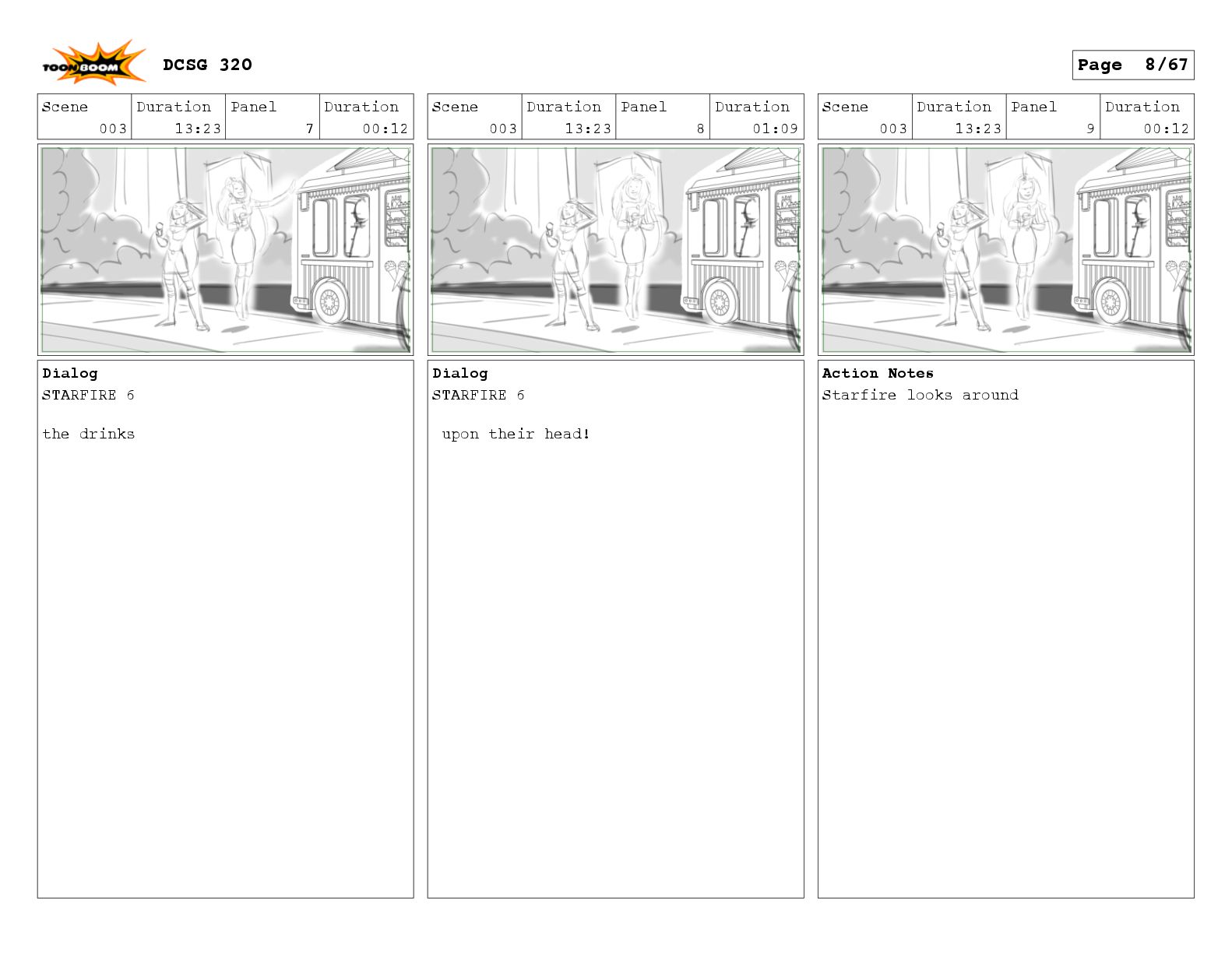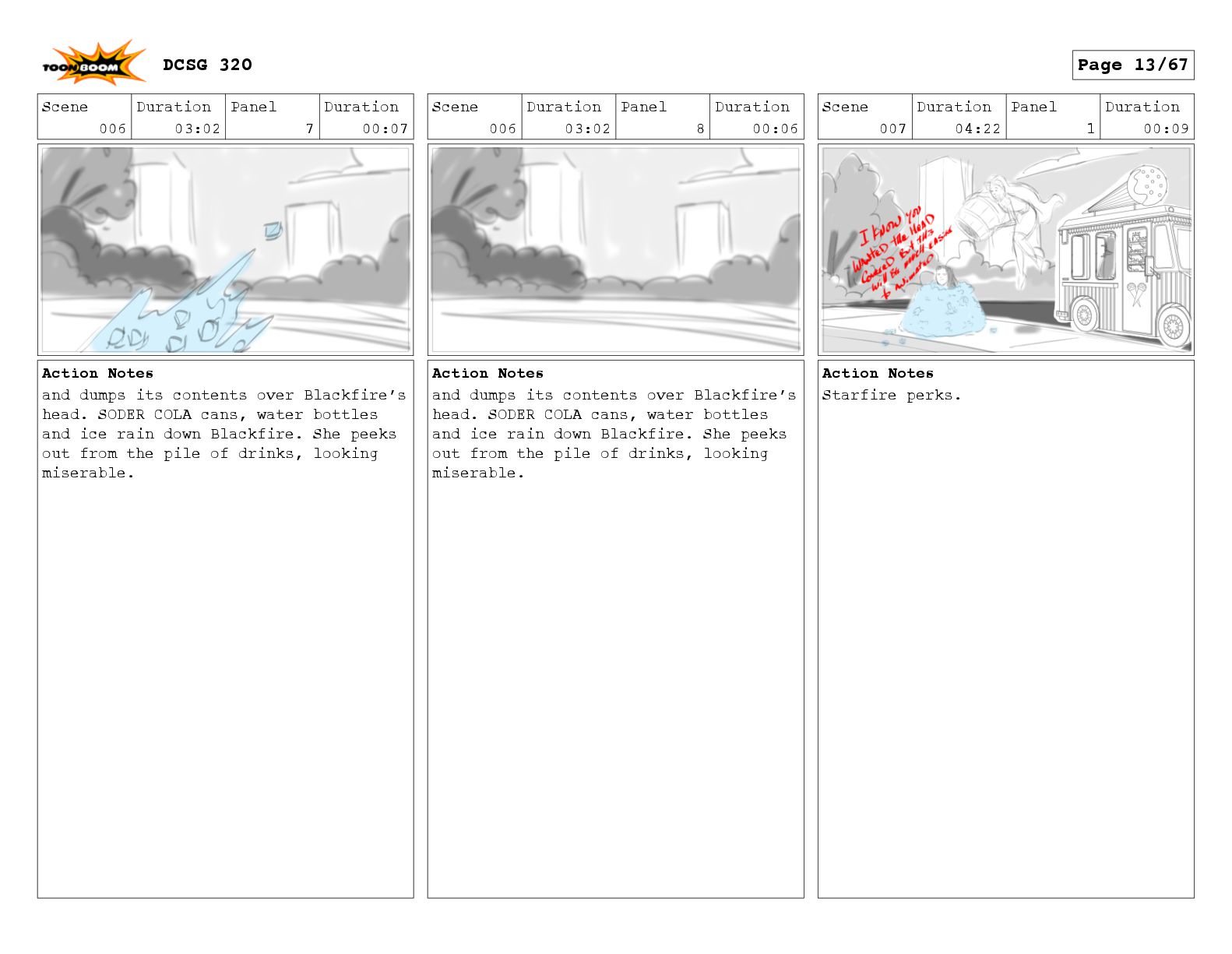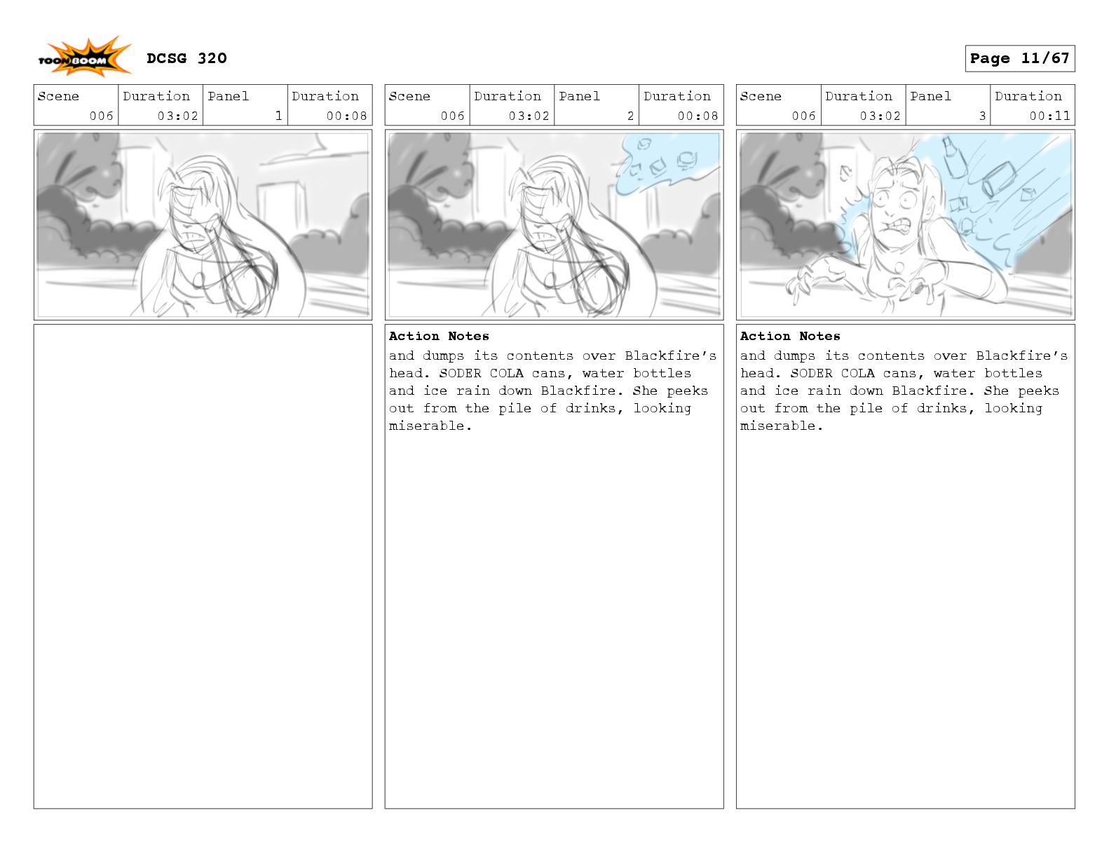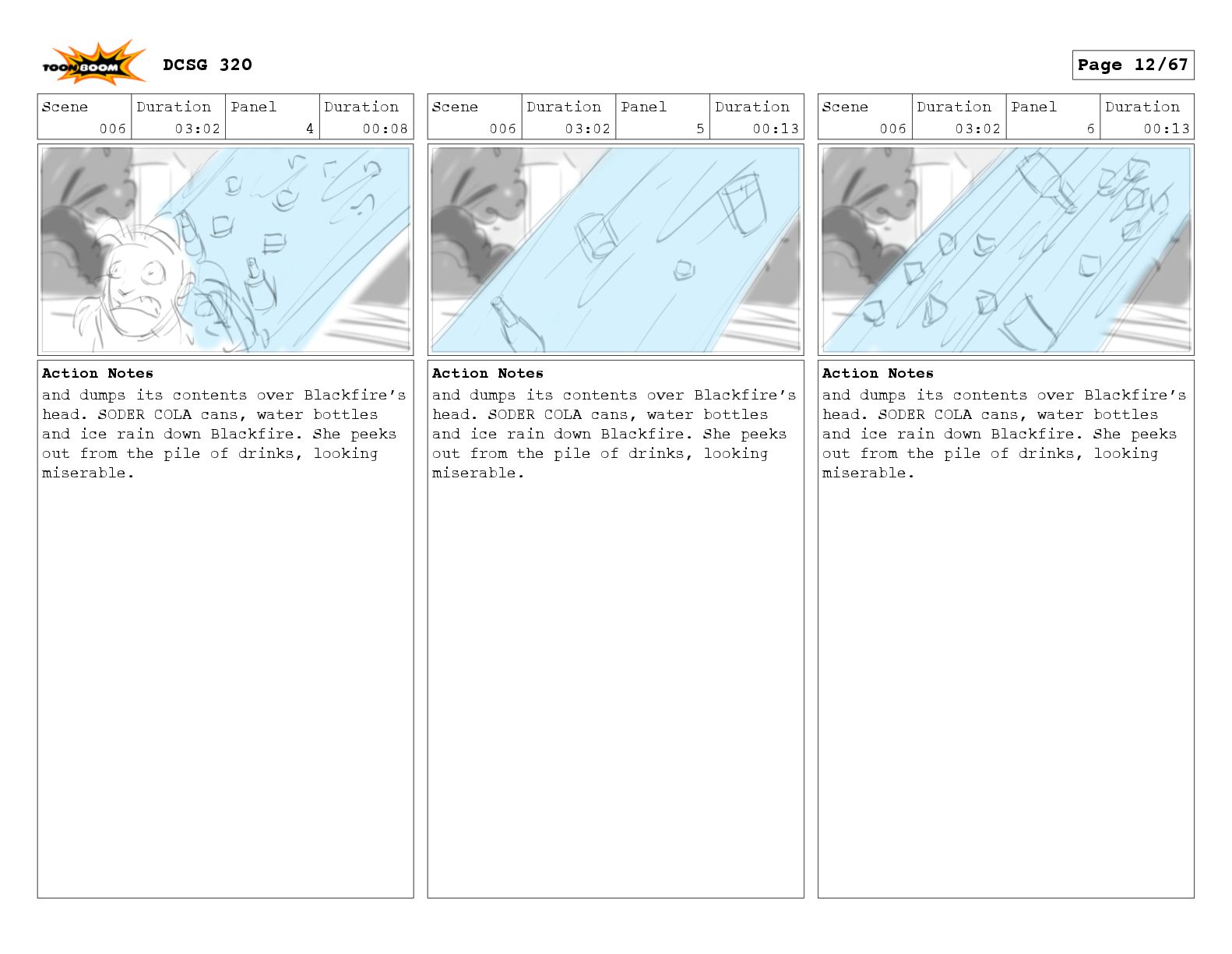and dumps its contents over Blackfire’s head. SODER COLA cans, water bottles and ice rain down Blackfire. She peeks out from the pile of drinks, looking miserable. Scene 006 Duration 03:02 Panel 5 Duration 00:13 Action Notes and dumps its contents over Blackfire’s head. SODER COLA cans, water bottles and ice rain down Blackfire. She peeks out from the pile of drinks, looking miserable. Scene 006 Duration 03:02 Panel 6 Duration 00:13 Action Notes and dumps its contents over Blackfire’s head. SODER COLA cans, water bottles and ice rain down Blackfire. She peeks out from the pile of drinks, looking miserable. DCSG 320 Page 12/67