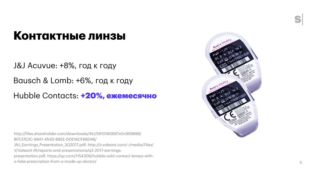 Lomb: +6%, год к году Hubble Contacts: +20%, ежемесячно 6 http://files.shareholder.com/downloads/JNJ/5910160687x0x959899/ BFE37E3C-99A1-454D-B8EE-D0E16CFB6046/ JNJ_Earnings_Presentation_3Q2017.pdf; http://ir.valeant.com/~/media/Files/ V/Valeant-IR/reports-and-presentations/q3-2017-earnings- presentation.pdf; https://qz.com/1154306/hubble-sold-contact-lenses-with- a-fake-prescription-from-a-made-up-doctor/