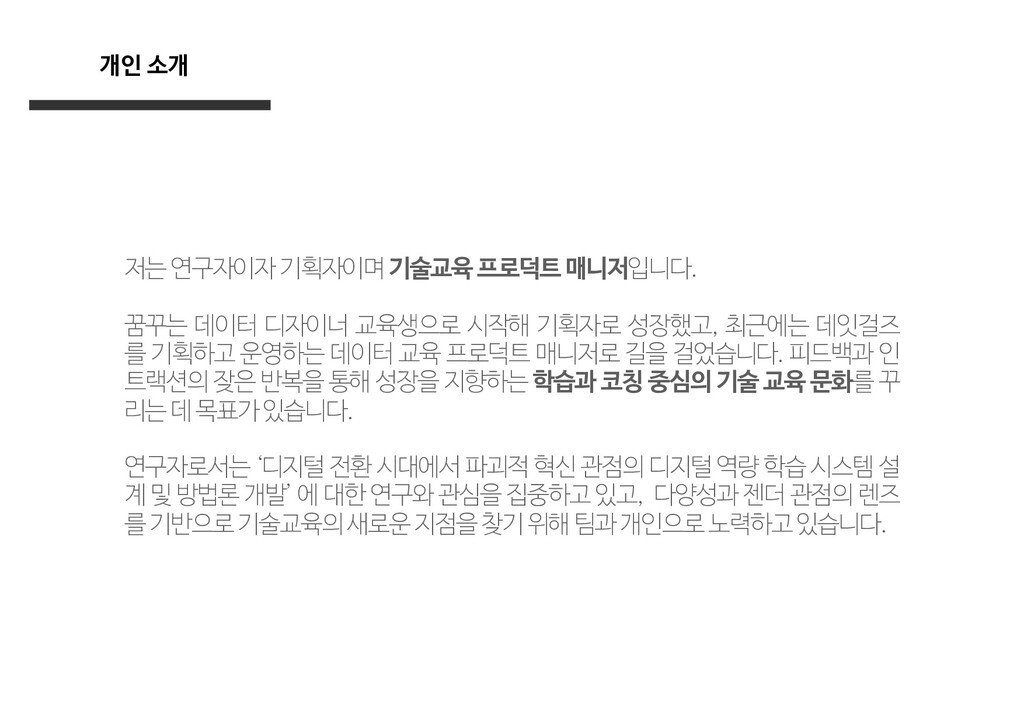 시작해 기획자로 성장했고, 최근에는 데잇걸즈 를 기획하고 운영하는 데이터 교육 프로덕트 매니저로 길을 걸었습니다. 피드백과 인 트랙션의 잦은 반복을 통해 성장을 지향하는 학습과 코칭 중심의 기술 교육 문화를 꾸 리는 데 목표가 있습니다. 연구자로서는 ‘디지털 전환 시대에서 파괴적 혁신 관점의 디지털 역량 학습 시스템 설 계 및 방법론 개발’ 에 대한 연구와 관심을 집중하고 있고, 다양성과 젠더 관점의 렌즈 를 기반으로 기술교육의 새로운 지점을 찾기 위해 팀과 개인으로 노력하고 있습니다. 개인 소개