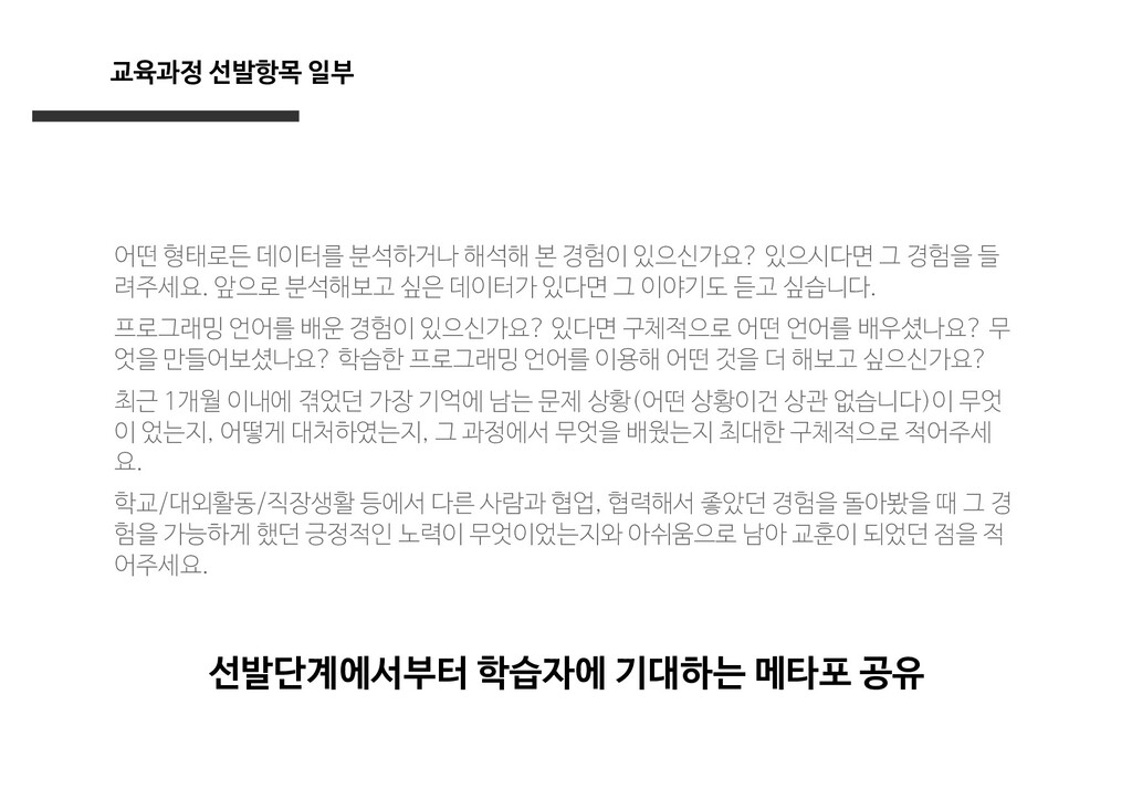 있으신가요? 있으시다면 그 경험을 들 려주세요. 앞으로 분석해보고 싶은 데이터가 있다면 그 이야기도 듣고 싶습니다. 프로그래밍 언어를 배운 경험이 있으신가요? 있다면 구체적으로 어떤 언어를 배우셨나요? 무 엇을 만들어보셨나요? 학습한 프로그래밍 언어를 이용해 어떤 것을 더 해보고 싶으신가요? 최근 1개월 이내에 겪었던 가장 기억에 남는 문제 상황(어떤 상황이건 상관 없습니다)이 무엇 이 었는지, 어떻게 대처하였는지, 그 과정에서 무엇을 배웠는지 최대한 구체적으로 적어주세 요. 학교/대외활동/직장생활 등에서 다른 사람과 협업, 협력해서 좋았던 경험을 돌아봤을 때 그 경 험을 가능하게 했던 긍정적인 노력이 무엇이었는지와 아쉬움으로 남아 교훈이 되었던 점을 적 어주세요. 선발단계에서부터 학습자에 기대하는 메타포 공유
