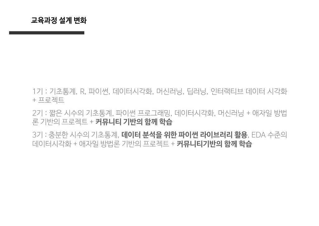 딥러닝, 인터랙티브 데이터 시각화 + 프로젝트 2기 : 짧은 시수의 기초통계, 파이썬 프로그래밍, 데이터시각화, 머신러닝 + 애자일 방법 론 기반의 프로젝트 + 커뮤니티 기반의 함께 학습 3기 : 충분한 시수의 기초통계, 데이터 분석을 위한 파이썬 라이브러리 활용, EDA 수준의 데이터시각화 + 애자일 방법론 기반의 프로젝트 + 커뮤니티기반의 함께 학습