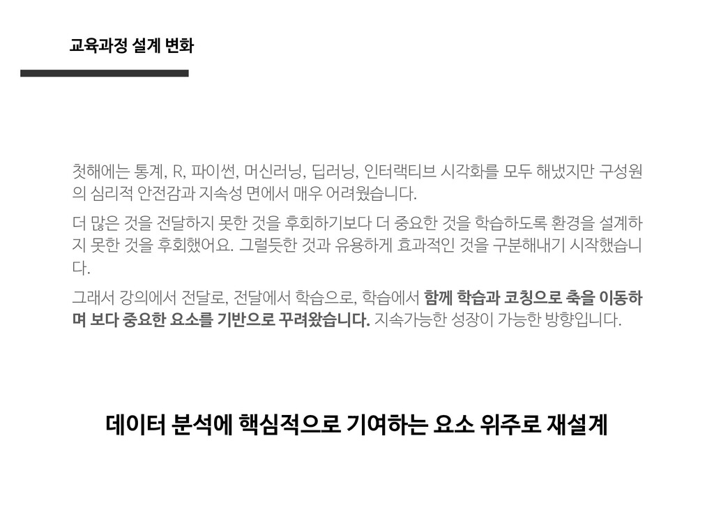 시각화를 모두 해냈지만 구성원 의 심리적 안전감과 지속성 면에서 매우 어려웠습니다. 더 많은 것을 전달하지 못한 것을 후회하기보다 더 중요한 것을 학습하도록 환경을 설계하 지 못한 것을 후회했어요. 그럴듯한 것과 유용하게 효과적인 것을 구분해내기 시작했습니 다. 그래서 강의에서 전달로, 전달에서 학습으로, 학습에서 함께 학습과 코칭으로 축을 이동하 며 보다 중요한 요소를 기반으로 꾸려왔습니다. 지속가능한 성장이 가능한 방향입니다. 데이터 분석에 핵심적으로 기여하는 요소 위주로 재설계