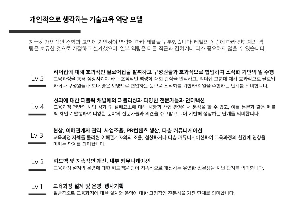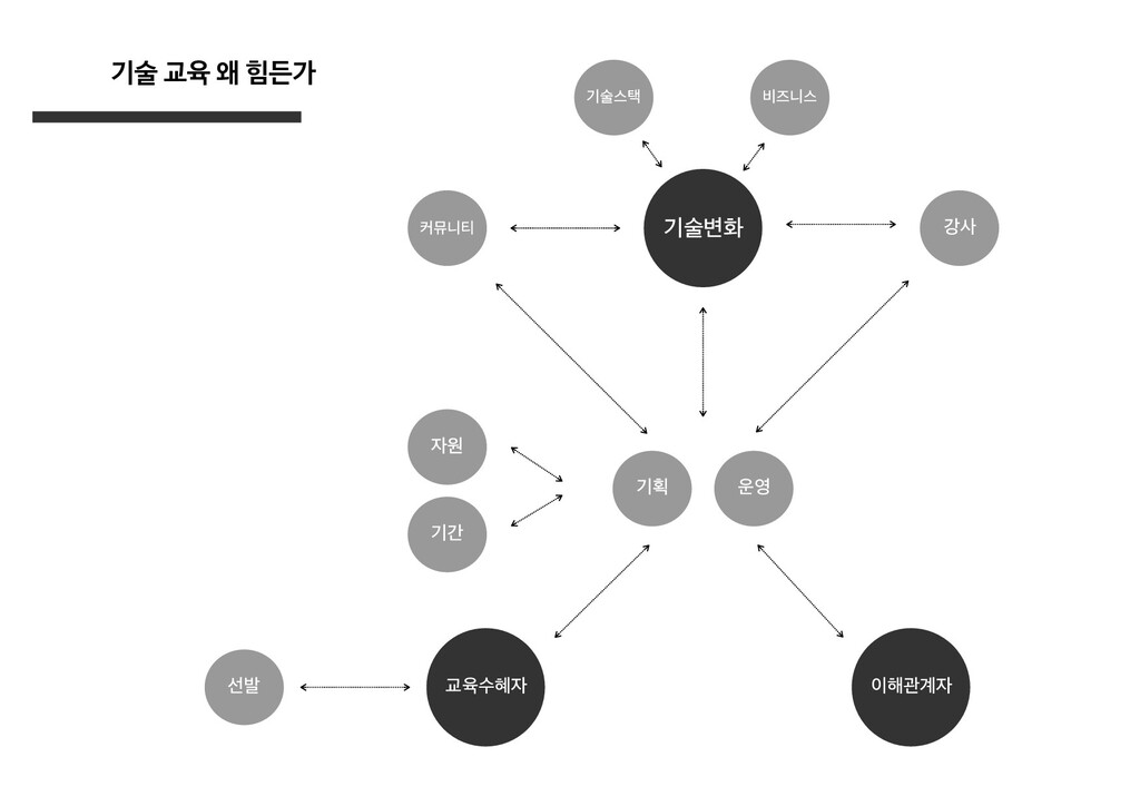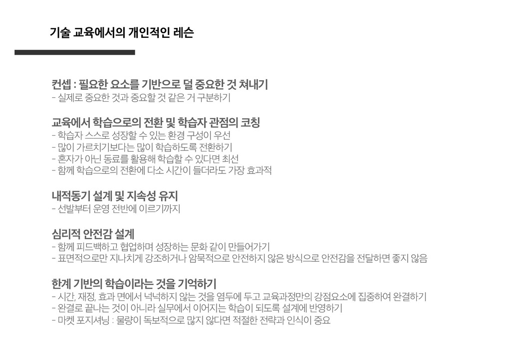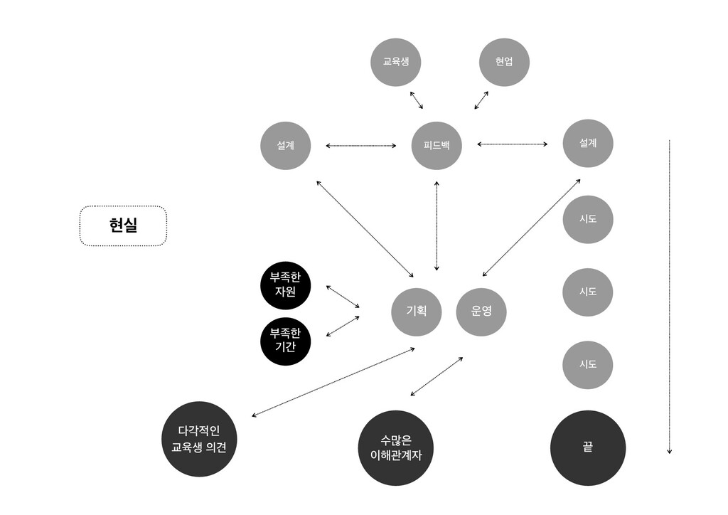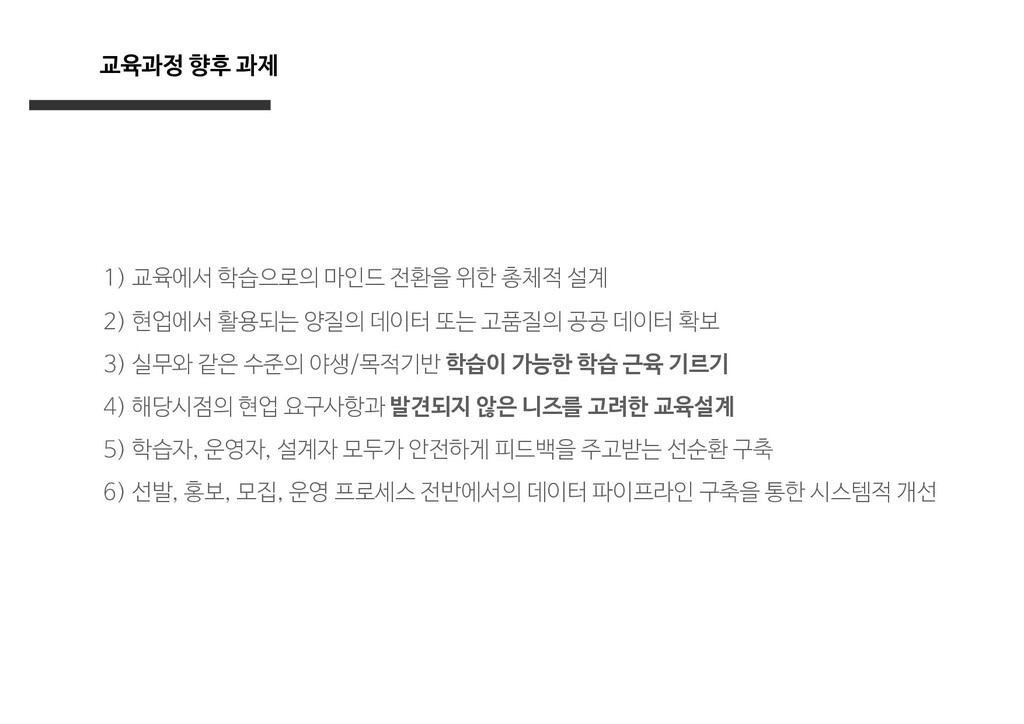 설계 2) 현업에서 활용되는 양질의 데이터 또는 고품질의 공공 데이터 확보 3) 실무와 같은 수준의 야생/목적기반 학습이 가능한 학습 근육 기르기 4) 해당시점의 현업 요구사항과 발견되지 않은 니즈를 고려한 교육설계 5) 학습자, 운영자, 설계자 모두가 안전하게 피드백을 주고받는 선순환 구축 6) 선발, 홍보, 모집, 운영 프로세스 전반에서의 데이터 파이프라인 구축을 통한 시스템적 개선